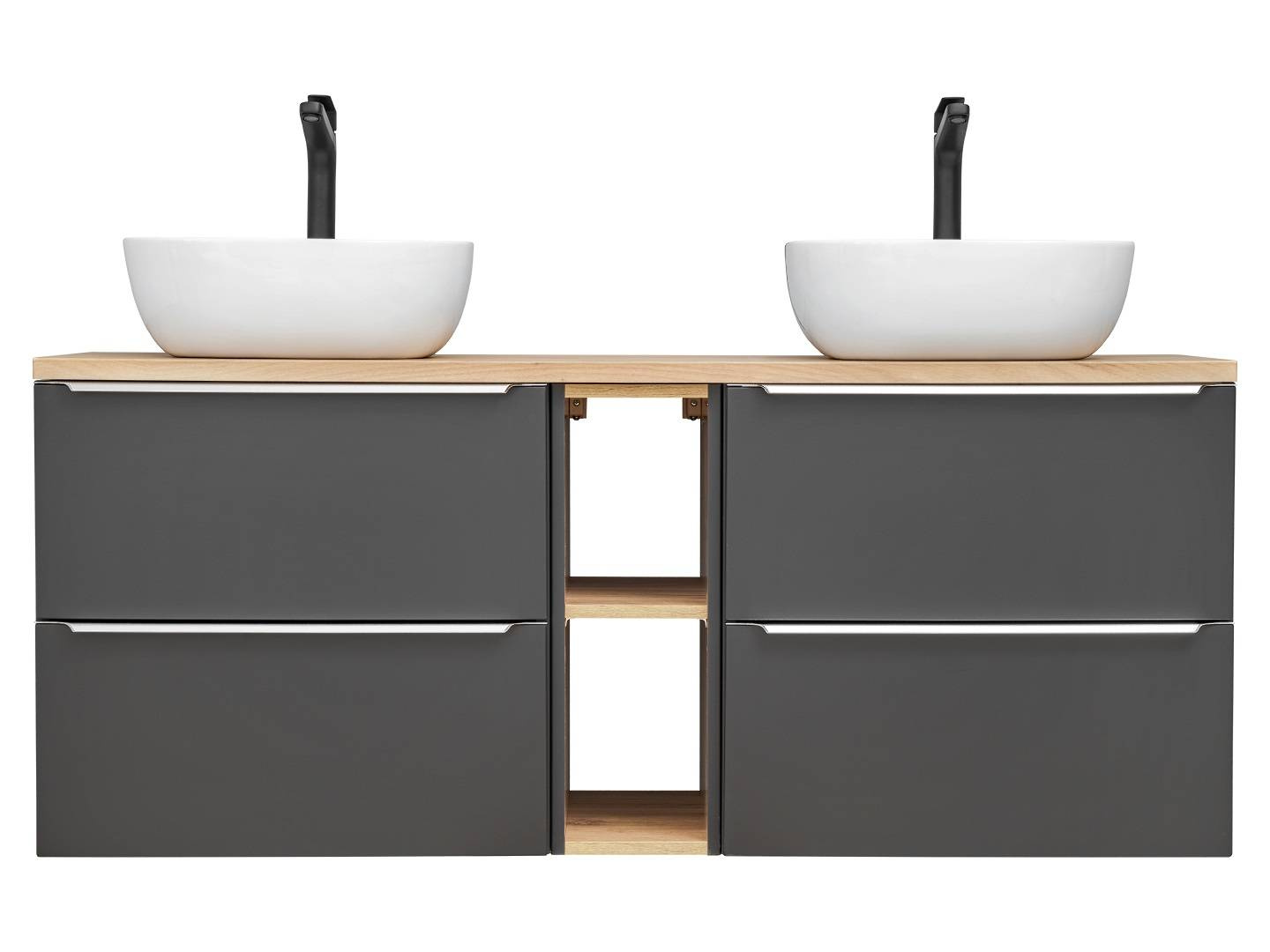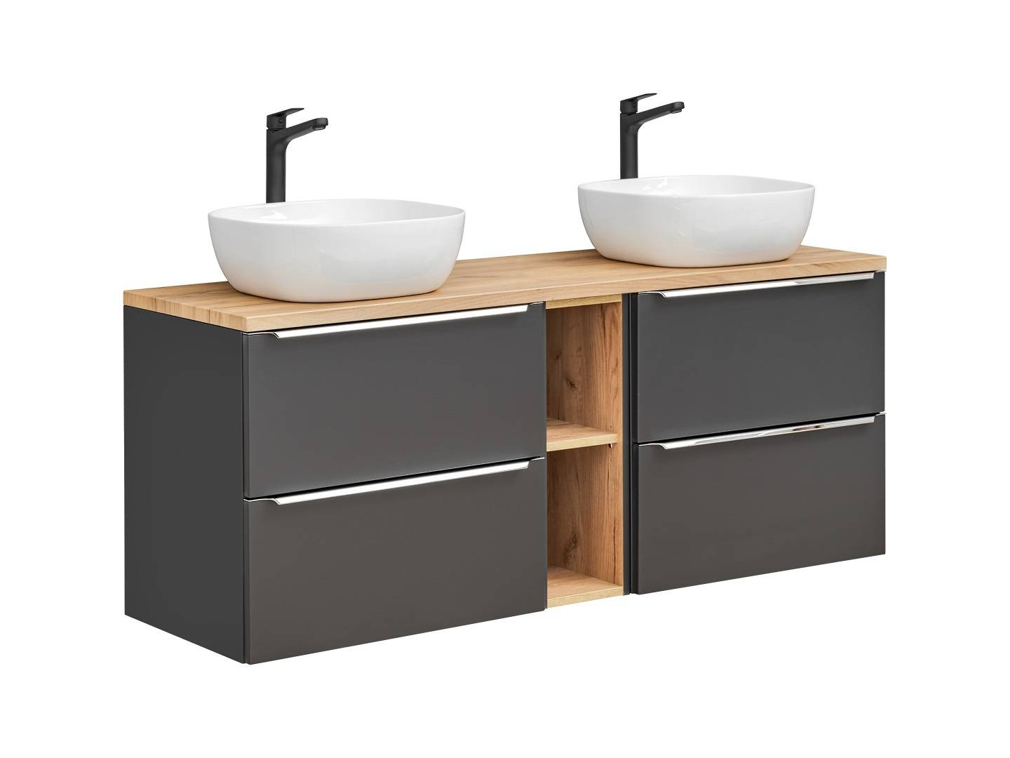- 2 x grafitowa szafka pod umywalkę z uchwytami krawędziowymi i dwiema szufladami z blatem 140 cm, słupkiem niskim i dwiema umywalkami nablatowymi.
