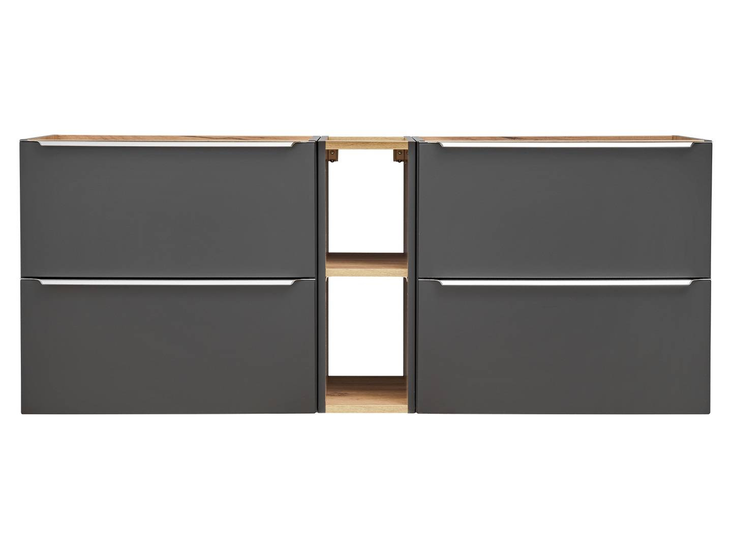 - 2 x grafitowa szafka pod umywalkę z uchwytami krawędziowymi i dwiema szufladami, słupek oraz blat 140 cm.