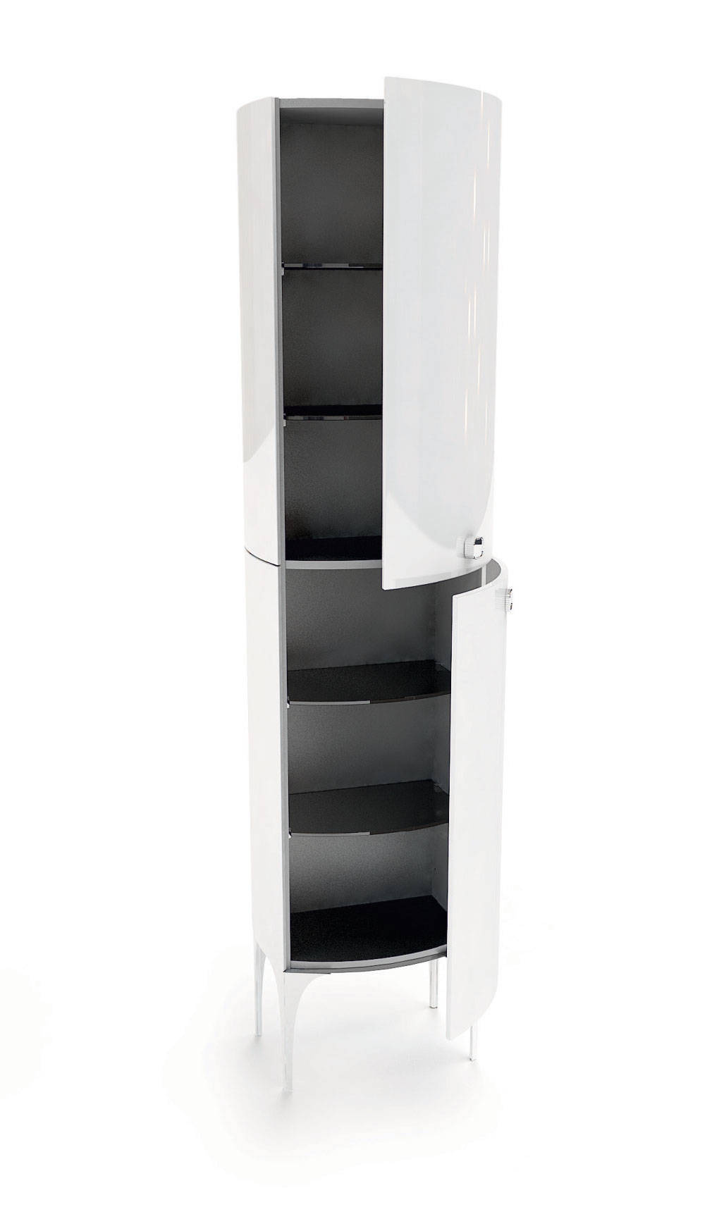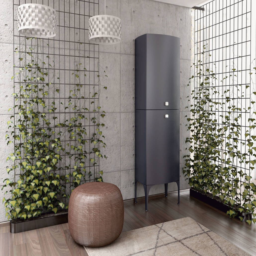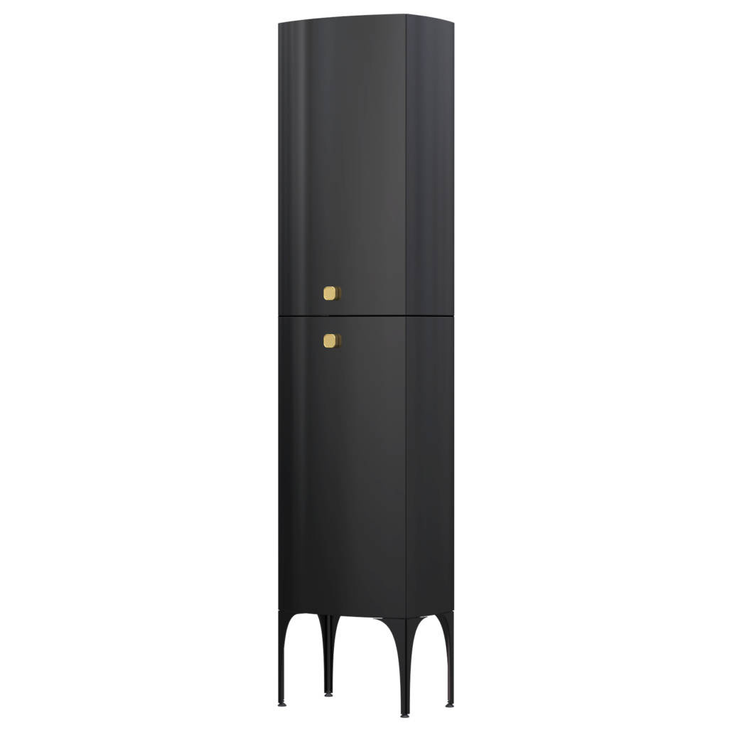 Szafka do skompletowania z nóżkami przednimi i tylnymi oraz uchwytami dostępnymi w aż 5 kolorach. Szafka posiada dwoje drzwi i 4 półki (dwie w górnej i dwie w dolnej części) z grafitowego szkła. Szafka dostępna w trzech kolorach: biały, czarny, granatowy.