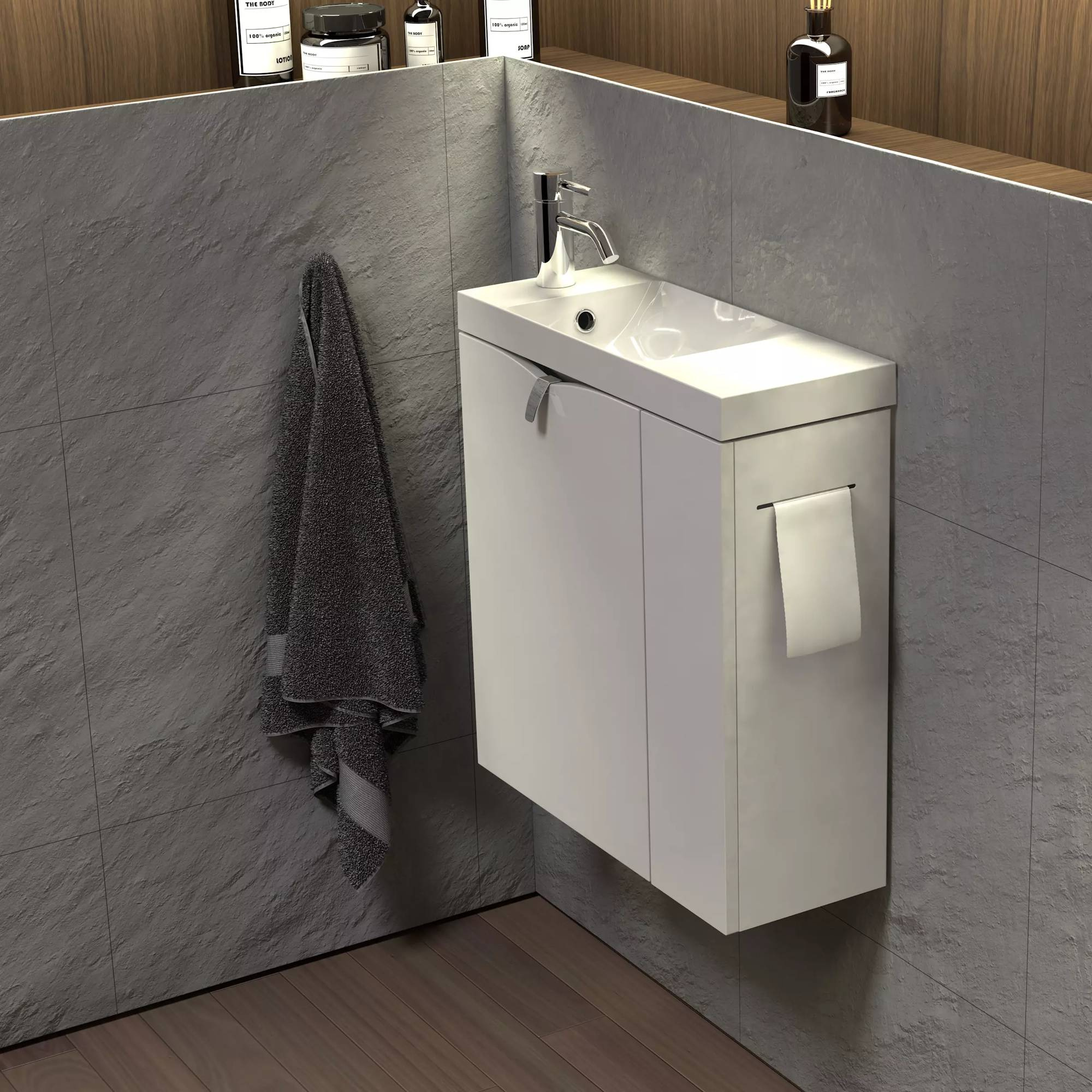 • Zestaw meblowy 55 cm, dwoje drzwi szafka SIENA, prawy, umywalka syntetyczna. Dozownik papieru i uchwyt na szczotkę WC po prawej stronie.