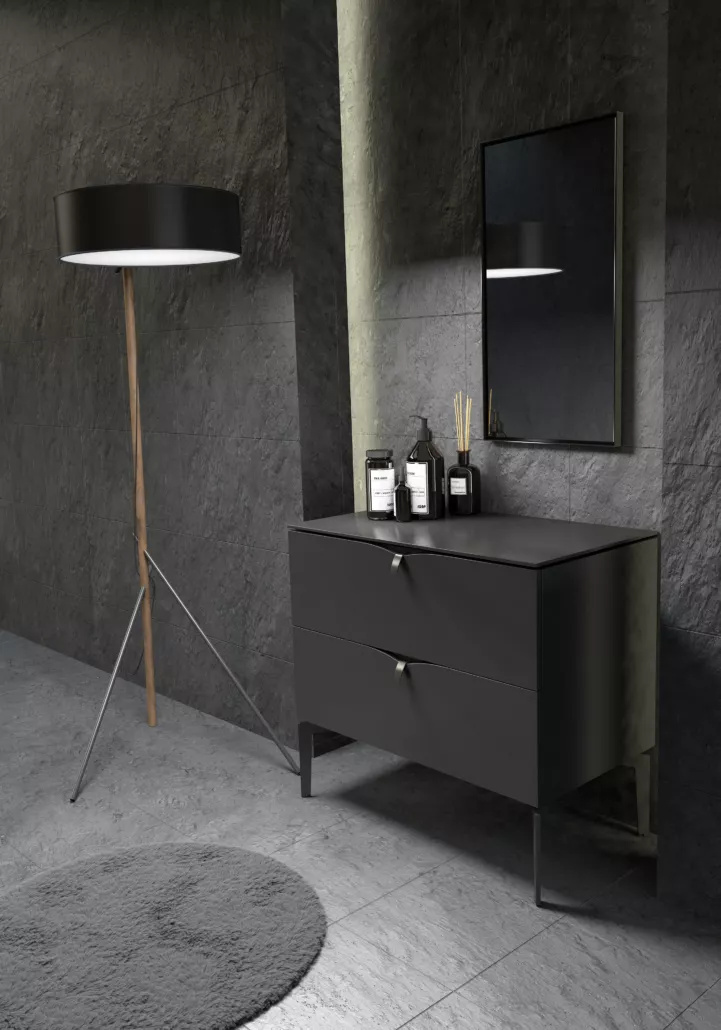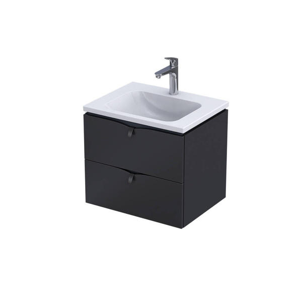 Szafka pod umywalkę o szerokości 60 cm w czarnym macie z dwiema szufladami. Uchwyty chromowane w kolorze srebrnym. Możliwość zamówienia uchwytów czarnych.