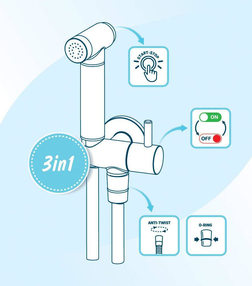 Praktyczny zestaw bidetta 3 w 1 przeznaczony jest dla mniejszych pomieszczeń, gdzie nie ma miejsca na tradycyjny bidet. Pomaga zachować wysoki poziom higieny, ale może posłużyć też do napełniania wodą wysokich naczyń czy prac porządkowych. Słuchawka ma wygodny przycisk start-stop. Dzięki niemu unikniesz przypadkowego chlapnięcia czy kapania wody podczas odkładania jej na uchwyt. Punktowe mocowanie oznacza, że montaż jest mało skomplikowany, a całość wygląda bardzo estetycznie. Z przyłączem kątowym.Uchwyt na słuchawkę jest tak dopasowany, aby łatwo było ją wyjmować i odkładać.