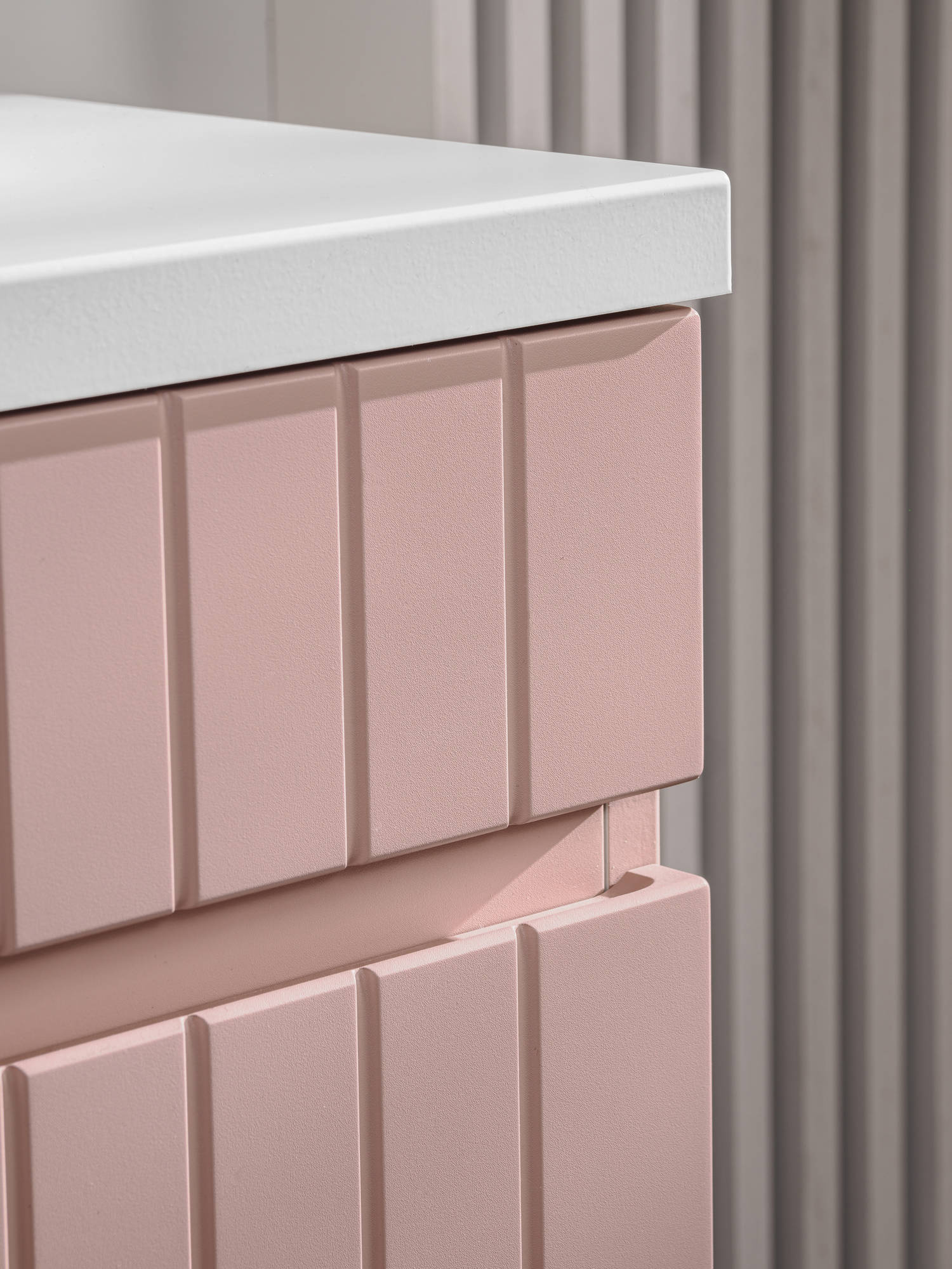 Szafka pod umywalkę ICONIC ROSE to elegancki dodatek do łazienki. Jej korpus i front w odcieniu Antycznej Róży z delikatnymi wstawkami w Alpejskiej Biel stwarzają harmonijną całość. Dzięki cichym domykom szuflad i zawiasów, użytkowanie jest komfortowe.