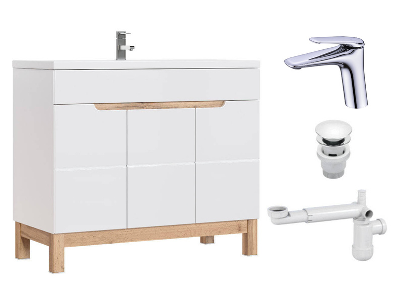 Szafka 100 cm Bali Biały z umywalką, baterią i syfonem z korkiem