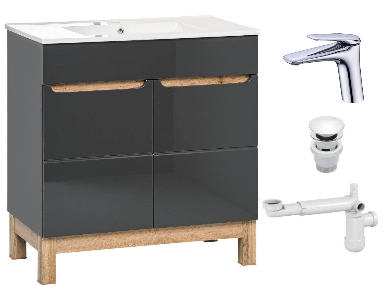 Szafka 80 cm Bali Szary z umywalką, baterią i syfonem z korkiem