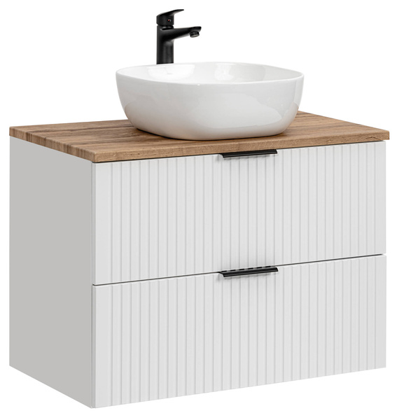 W zestawie znajduje się nowoczesna, ceramiczna umywalka nablatowa Smile, która nie tylko wygląda doskonale, ale również jest łatwa w codziennej pielęgnacji. Jej głębokie wnętrze sprawia, że korzystanie z niej to czysta przyjemność, a gładkie powierzchnie ułatwiają utrzymanie czystości. Blat łazienkowy Wotan o szerokości 80 cm nie tylko zapewnia odpowiednią przestrzeń do codziennych czynności, ale również staje się wygodnym miejscem na kosmetyki oraz akcesoria łazienkowe.