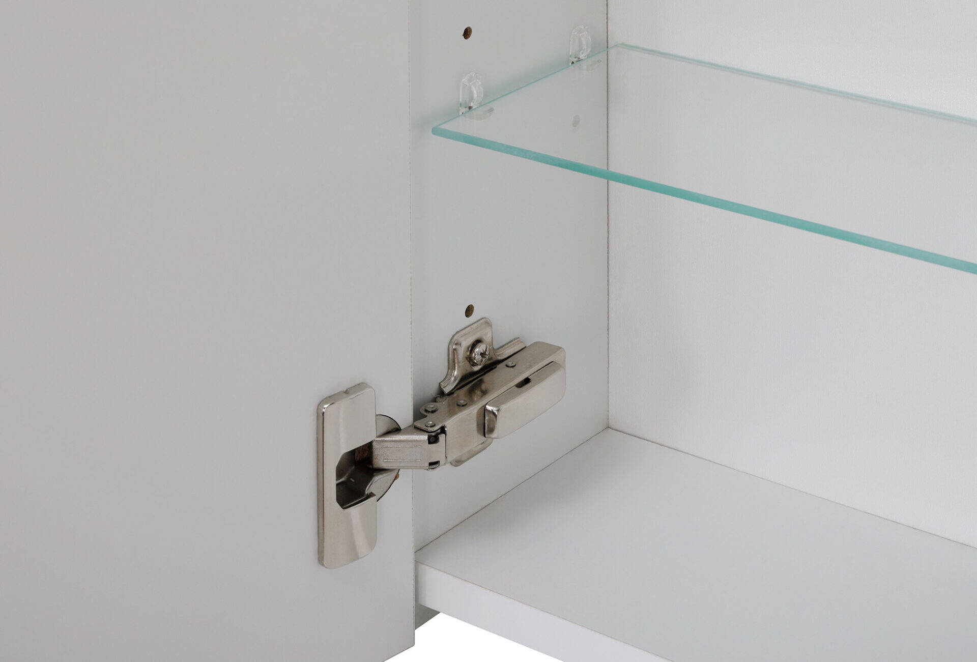 Mimo swojej delikatnej formy, szafka kryje w sobie praktyczne rozwiązania. Dwie szklane półki pozwalają na wygodne przechowywanie najpotrzebniejszych kosmetyków i akcesoriów. Z chromowanymi uchwytami i metalowymi zawiasami, otwieranie i zamykanie drzwi odbywa się płynnie, a funkcja cichego domyku dodaje luksusowego charakteru i komfortu użytkowania.