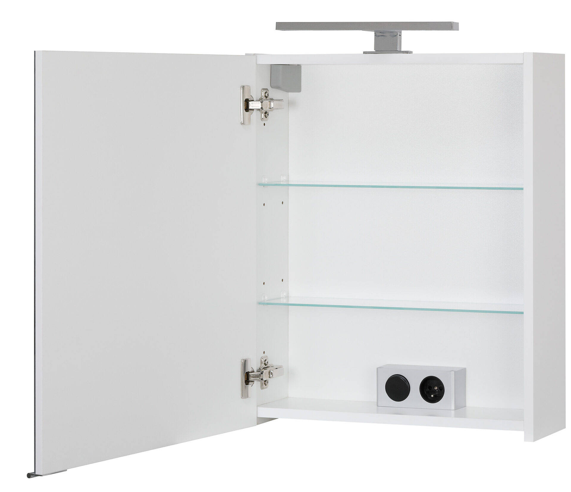 Elegancka szafka Astor z lustrem i białym połyskiem to idealne połączenie stylu i funkcji. Zawiera dwie szklane półki, chromowane uchwyty i cichy domyk. Wyposażona w oświetlenie LED i gniazdko. Możliwość samodzielnego montażu i regulacji kierunku drzwi.