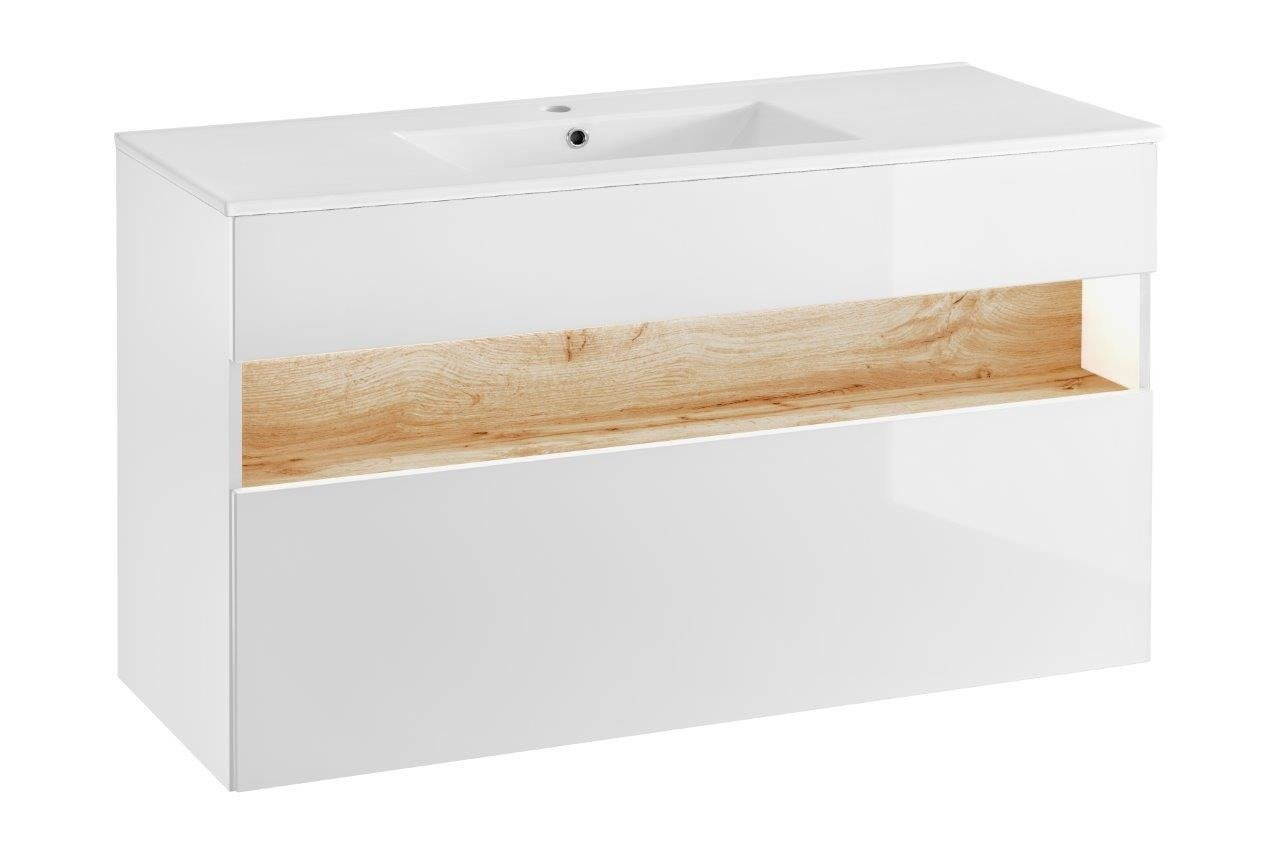 Bahama White to nie tylko niezwykle elegancka, ale również stylowa kolekcja mebli łazienkowych. Zestaw składa się z niskiej szafki pod umywalkę w dwóch wariantach, szafki z lustrem oraz wysokiej szafki z otwartymi, szklanymi półkami, które doskonale eksponują stylowe dodatki i akcesoria. Wszystkie drzwiczki posiadają system cichego domyku. Szafki Bahama White mogą być zamontowane na ścianie, co pozwala uzyskać zachwycający efekt, a dodatkowo ułatwia utrzymanie czystości w łazience. Serię dopełnia okrągłe lustro Rossi z podświetleniem LED, które dodaje nowoczesnego charakteru. Białe, laminowane fronty w połączeniu z drewnem w ciepłym odcieniu tworzą klimat eleganckiego SPA. Seria ta zachwyci nawet najbardziej wymagających miłośników minimalizmu w eleganckim wydaniu.