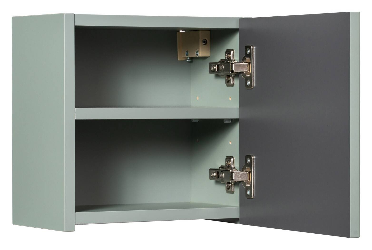 Szafka posiada jedne drzwi z uniwersalnymi zawiasami i zintegrowanym uchwytem, również w kolorze Reed Green, co tworzy spójną i harmonijną całość. Drzwi wyposażone są w system cichego domyku, co gwarantuje komfort użytkowania.