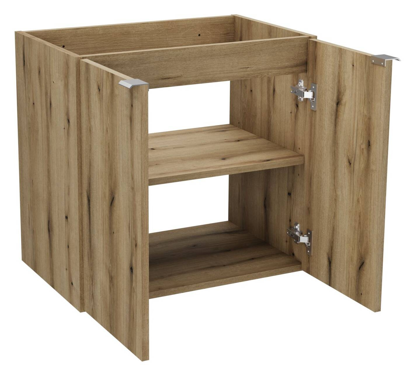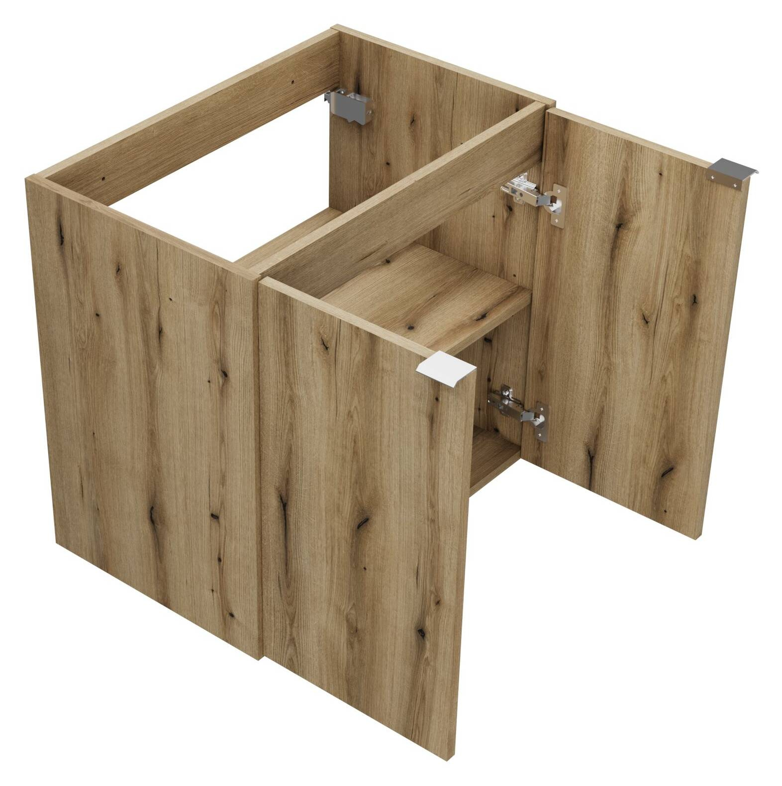 - Szafka pod umywalkę Nova Oak 60 cm, elegancka i solidna. Kolor Dąb Cost Evoke, cichy domyk, chromowane uchwyty, 1 stała i 1 regulowana półka.
