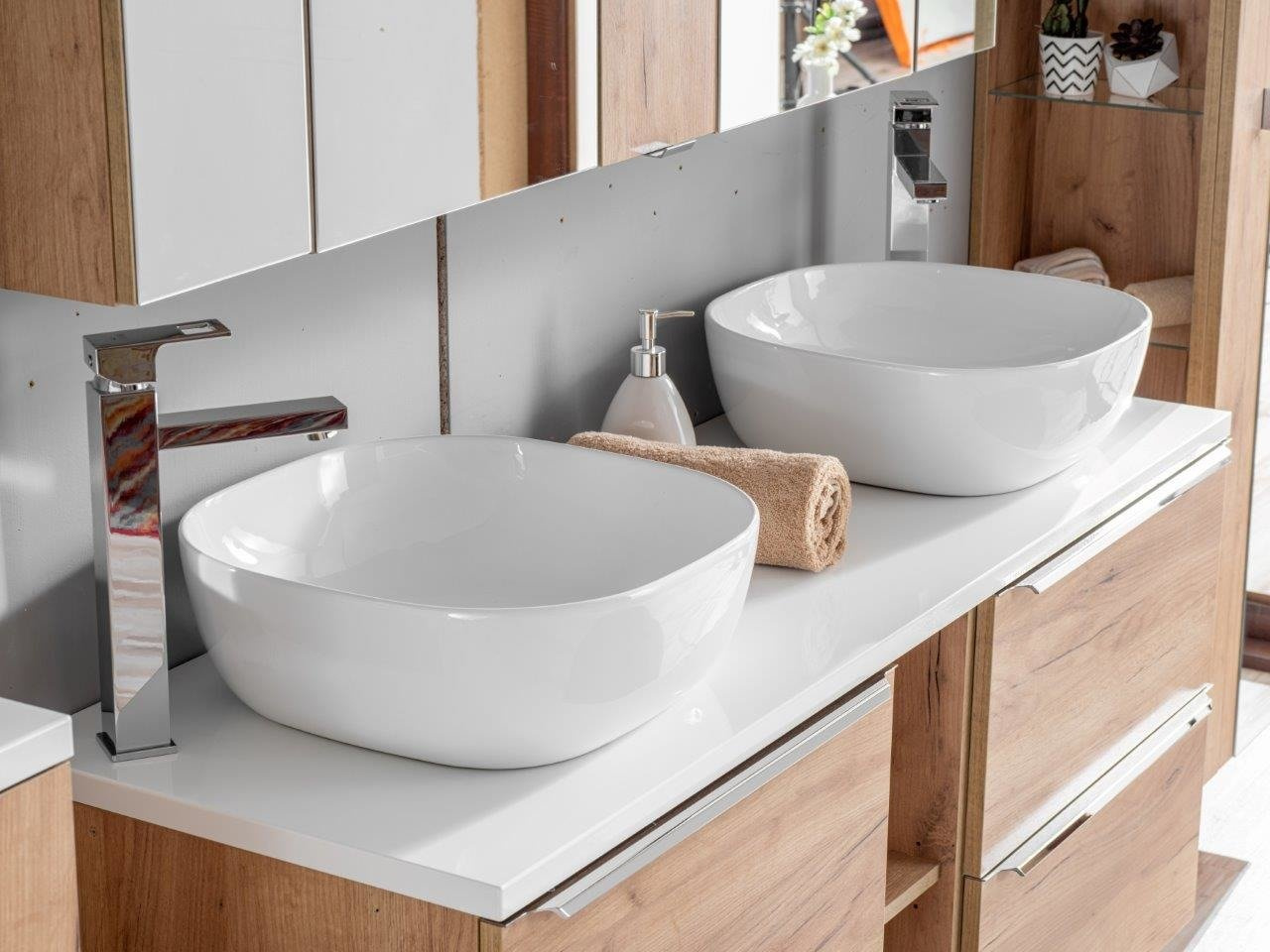 Wyjątkowość kolekcji CAPRI DĄB ZŁOTY wynika przede wszystkim z połączenia prostej i stonowanej formy z pięknym dekorem pozwalając stworzyć harmonijne, eleganckie wnętrze. Geometryczną formę mebli podkreślają krawędziowe uchwyty. Kolekcja posiada szeroką gamą brył, w tym funkcjonalną szafkę z blatem, dającą dodatkową przestrzeń użytkową. Komfort użytkowania podnoszą zastosowane w szufladach prowadnice i zawiasy z funkcją cichego domyku, dzięki którym zamykają się one cicho i łagodnie. Nowoczesnym akcentem w tej kolekcji jest opcja dodania oświetlenia do szuflad w szafkach pod umywalkę.