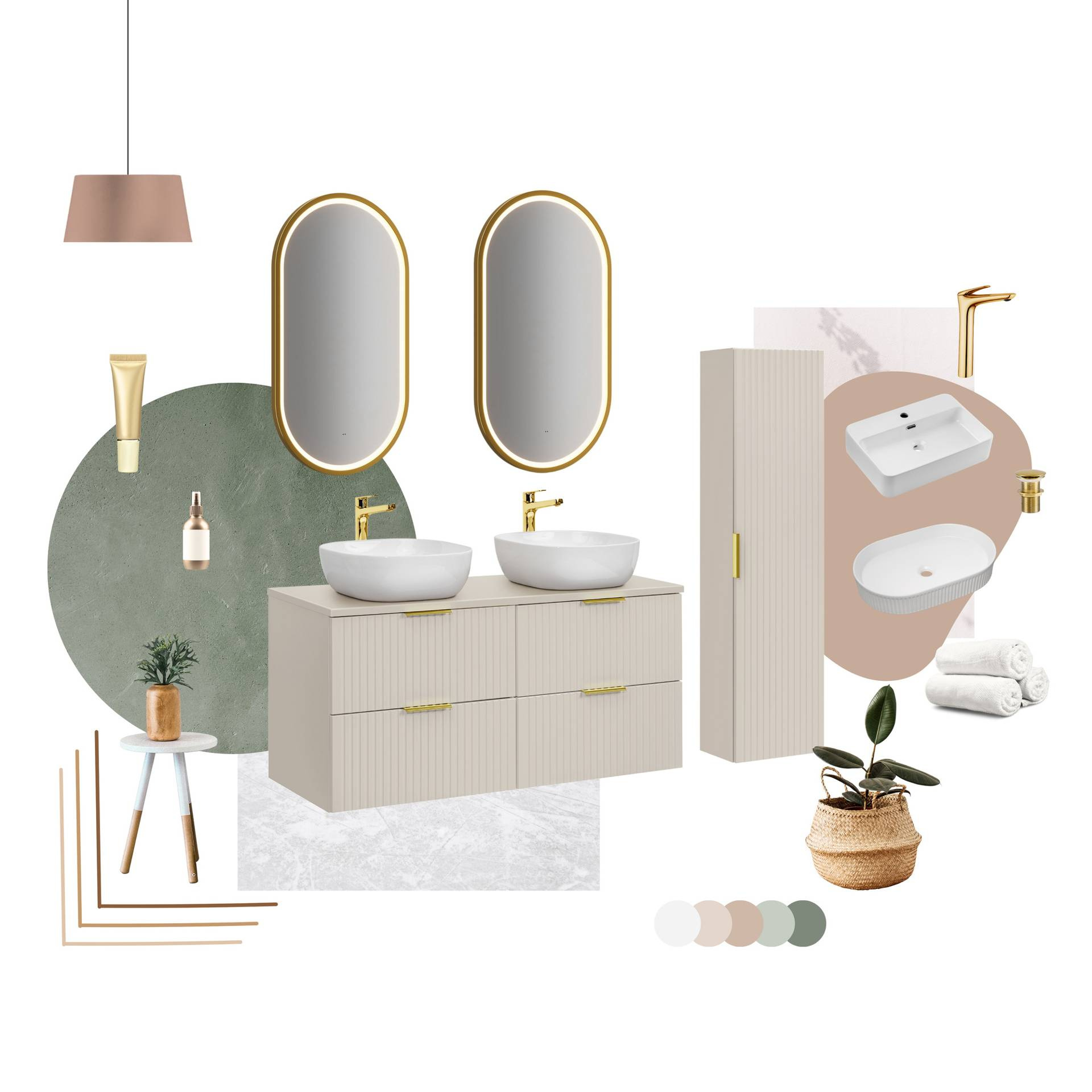 Zestaw Smile 120 cm od Comad to elegancja w kaszmirowym odcieniu. Wysoka szafka z frezowanymi frontami oraz nowoczesne umywalki ceramiczne dodają stylu. Laminowana płyta MDF zapewnia trwałość, a złote i czarne uchwyty dopełniają całość.