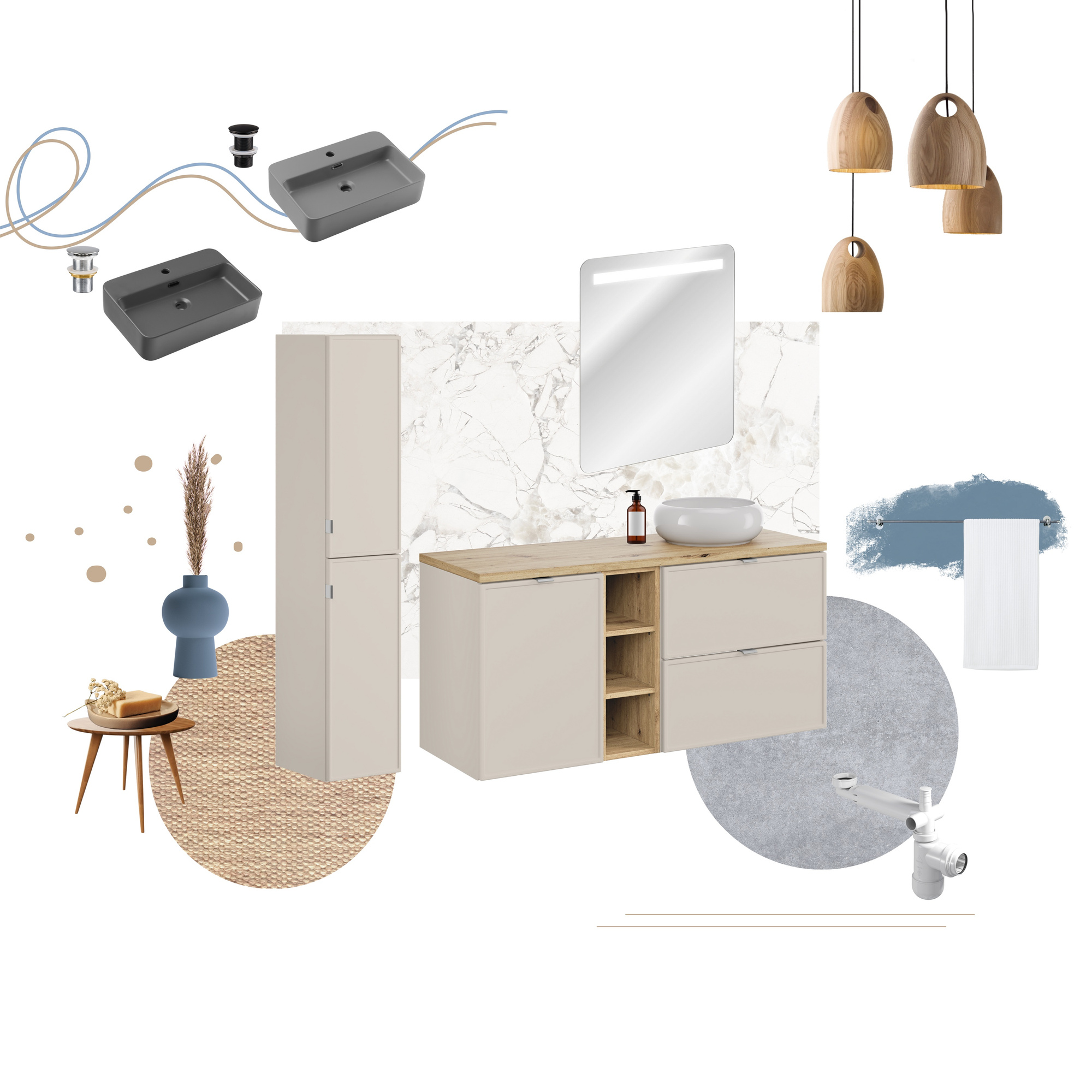 Zestaw Bella Cashmere to idealna propozycja do nowoczesnej łazienki. Elegancki kolor kaszmirowy mat oraz frezowane fronty dodają finezji. Oferuje funkcjonalność - umywalka nablatowa, szafka z koszem na pranie i dwa pojemne schowki. Styl i praktyczność.