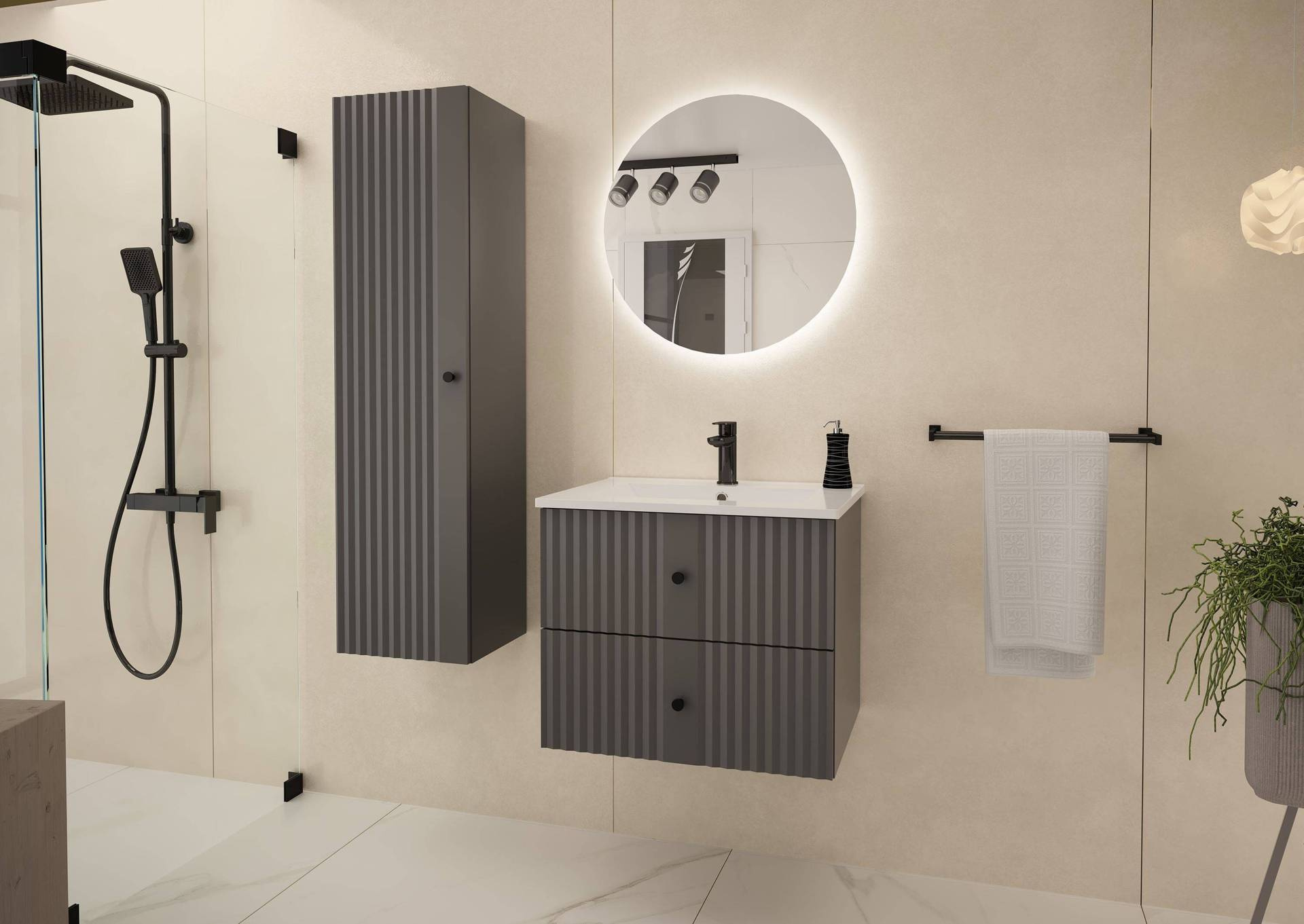 Elegancka szafka XILO-02 w szarym macie idealnie wpasuje się w nowoczesną łazienkę. Fronty z płyt MDF i metalowe uchwyty w szczotkowanym złocie dodają szyku. Prowadnice z cichym domykiem zapewniają komfort. Montaż do samodzielnego wykonania.