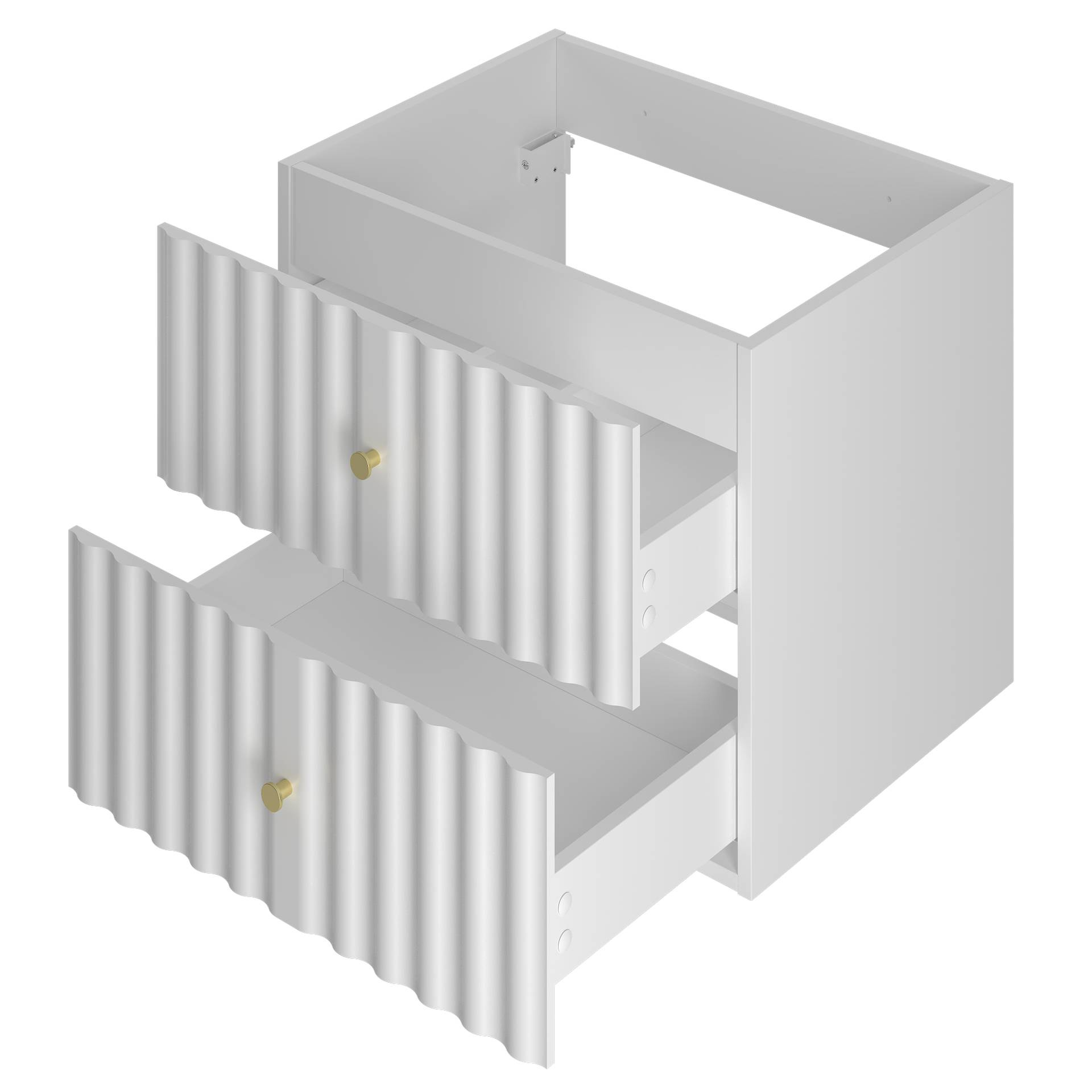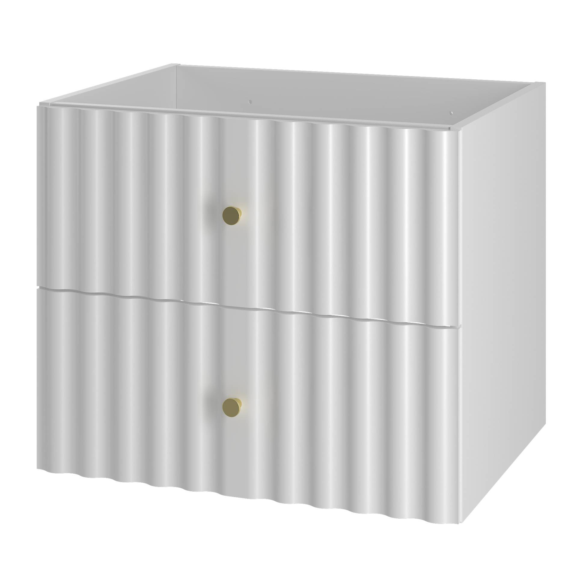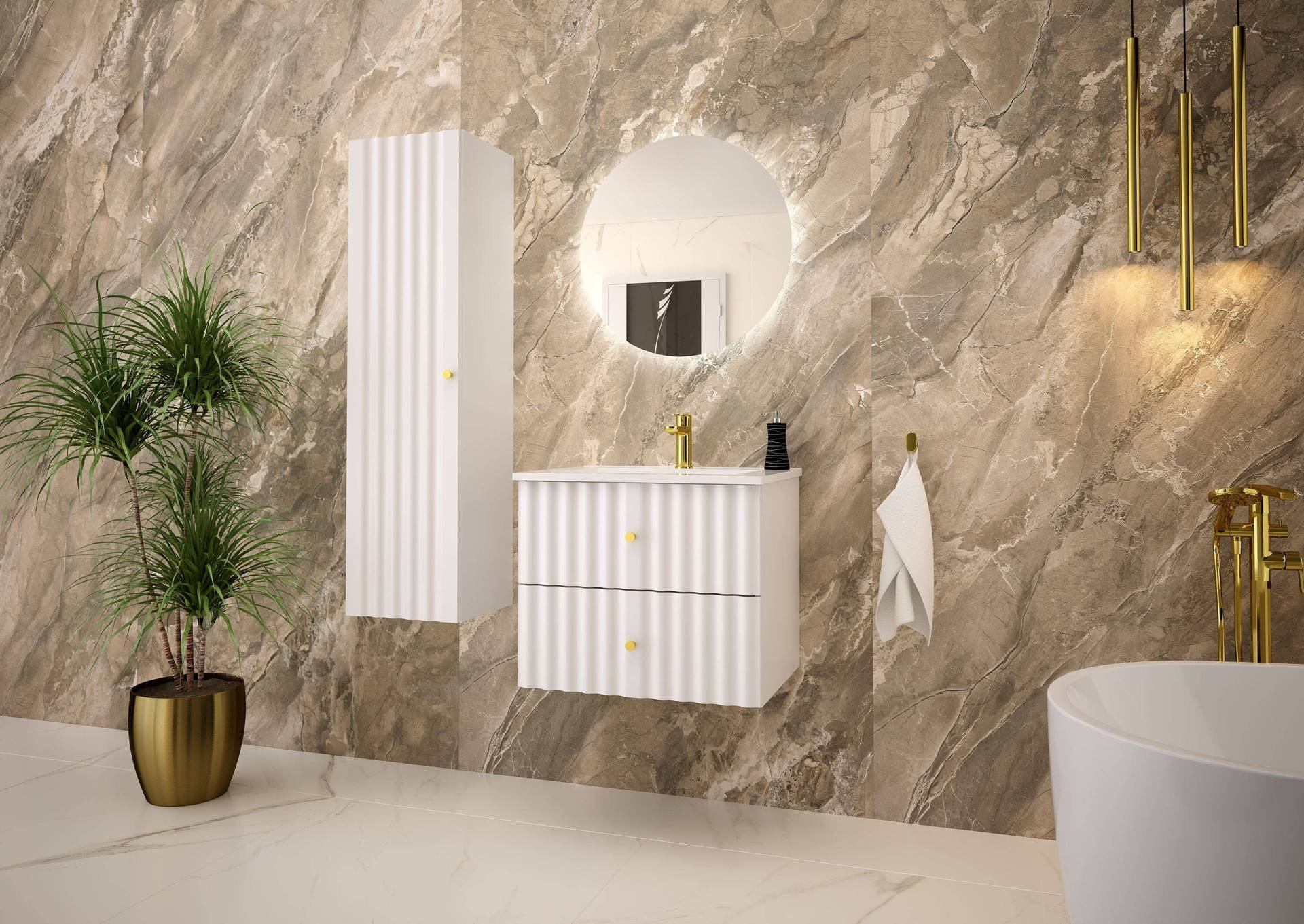 Szafka pod umywalkę AQUA-02 marki Megstyl to elegancja w białym macie. Wykonana z płyty MDF z laminowanym korpusem, posiada metalowe uchwyty w kolorze szczotkowanego złota i cichy domyk. Idealna opcja do samodzielnego montażu.