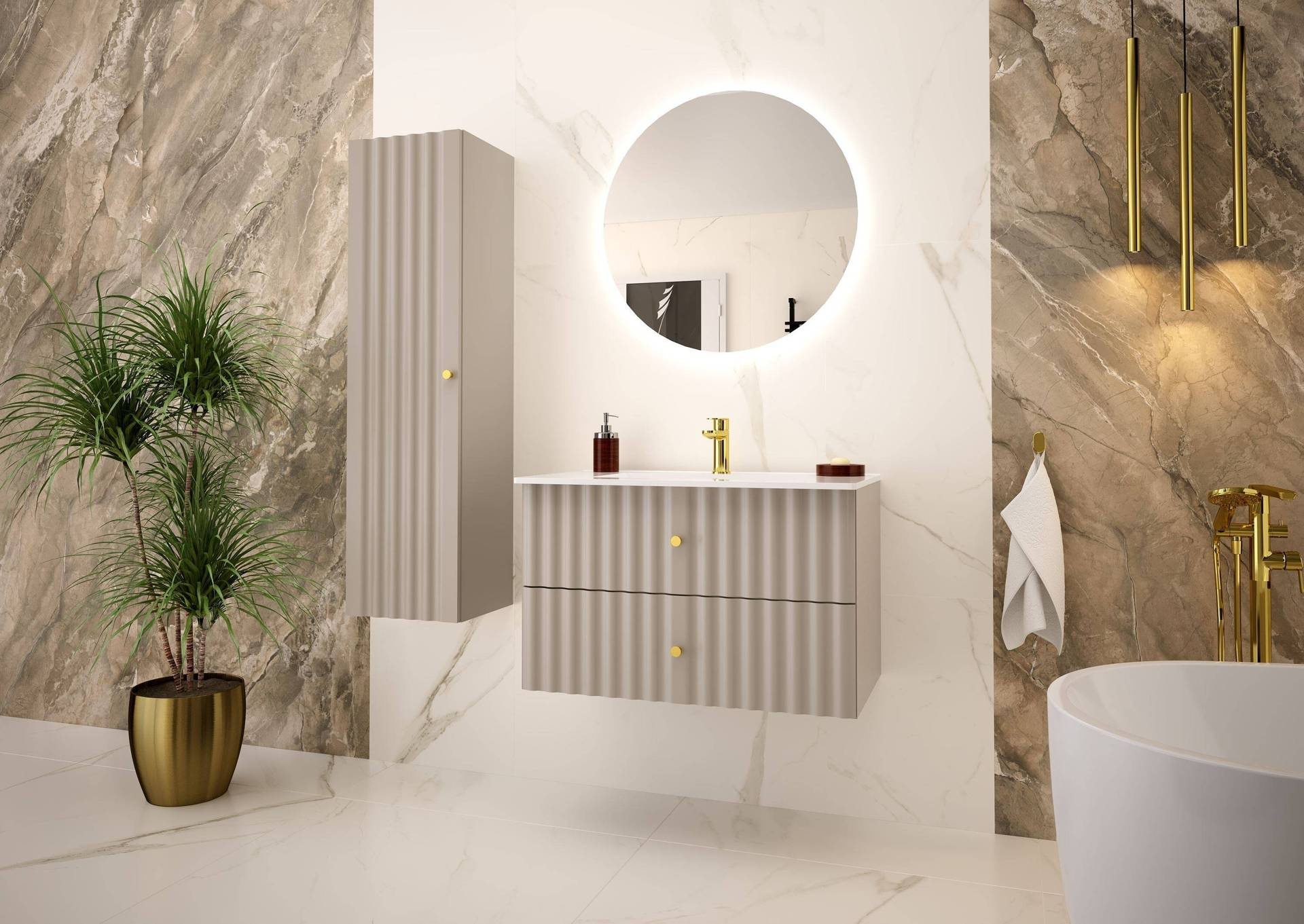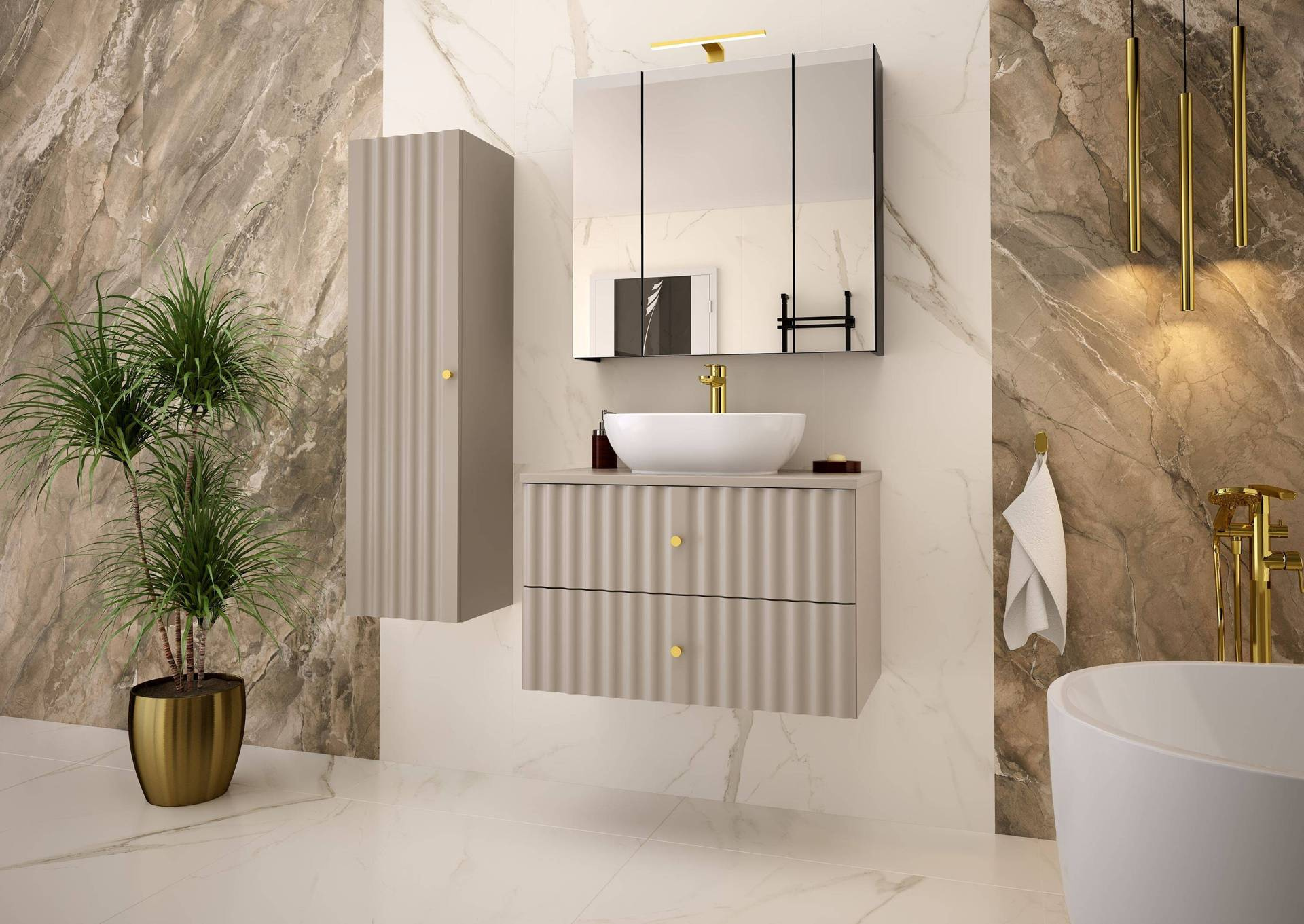 • Stylowa szafka pod umywalkę AQUA-01 od Megstyl w kolorze kaszmir. Wysokiej jakości fronty MDF i korpus z płyty laminowanej. Funkcjonalność zapewnia cichy domyk. Metalowe uchwyty w szczotkowanym złocie dodają elegancji. Idealna do nowoczesnych łazienek.