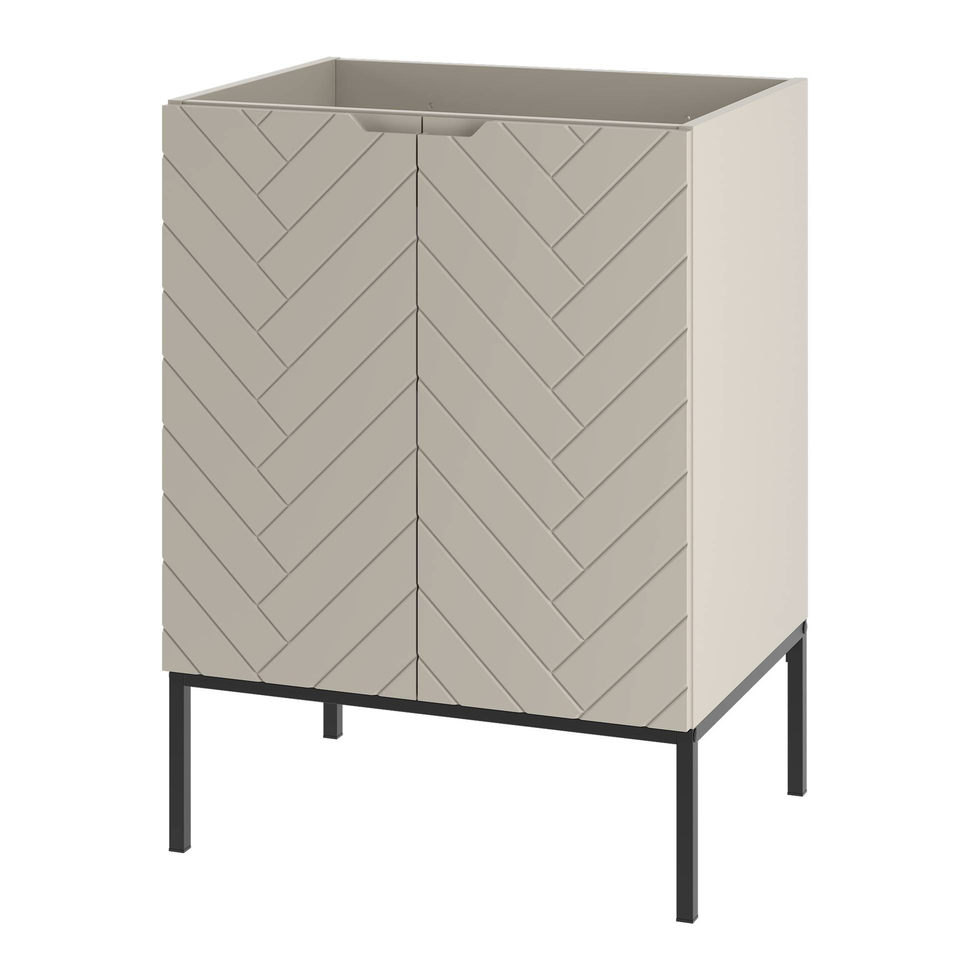 Stylowa szafka ASPEN-09 w kolorze kaszmir z eleganckim czarnym stelażem. Wykonana z trwałej płyty MDF i laminowanej, z puszkowymi zawiasami i cichym domykaniem. Idealna do nowoczesnej łazienki. Samodzielny montaż.