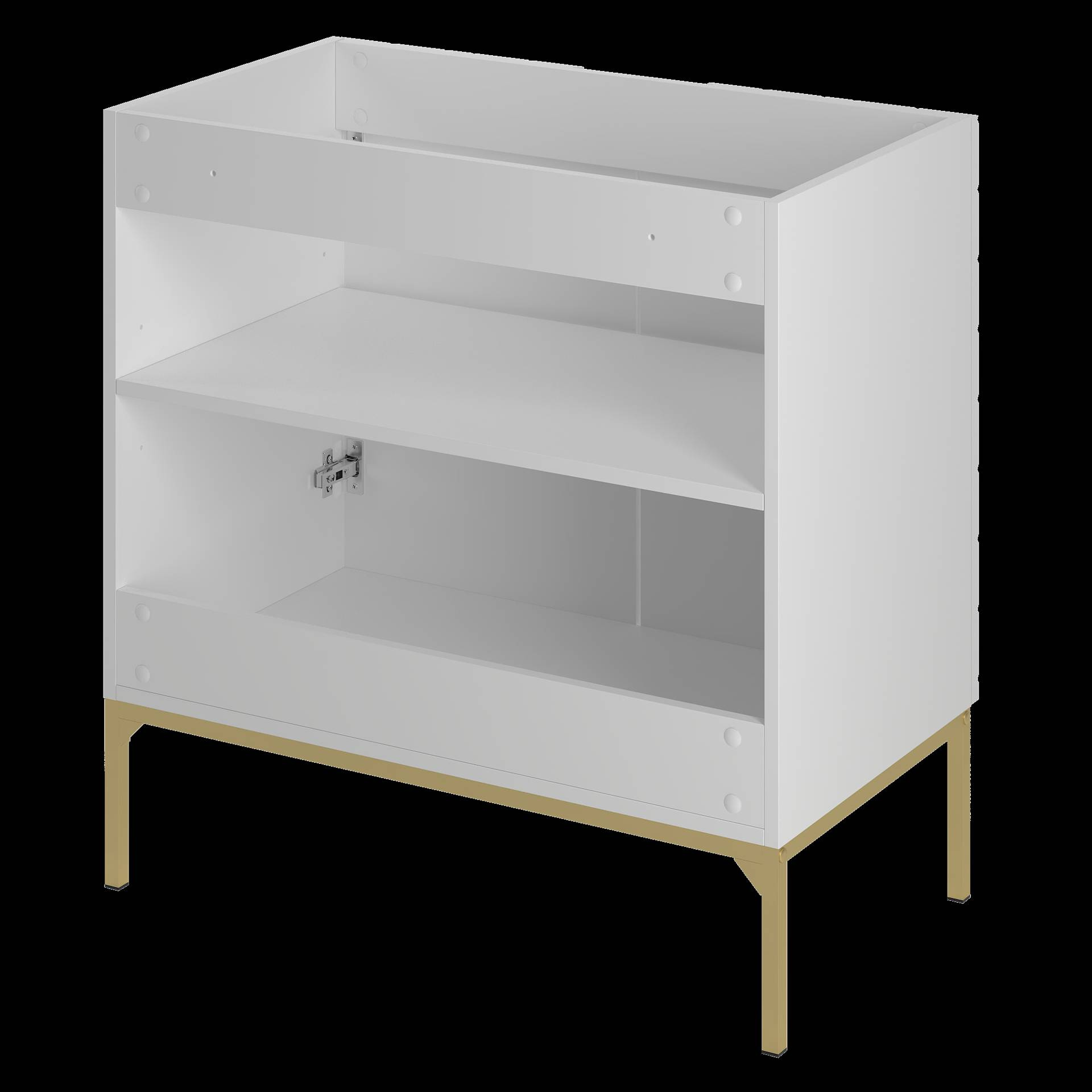 • Szafka ASPEN-08 to elegancka podstawa pod umywalkę z białym matowym wykończeniem i metalowym złotym stelażem. Wykonana z płyty MDF i laminowanej, oferuje ciche domykanie drzwi. Idealna do nowoczesnych łazienek. Produkt do samodzielnego montażu.