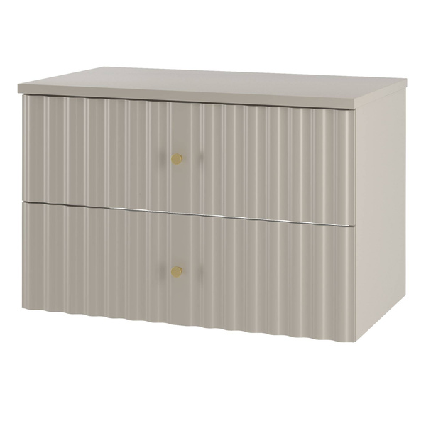 Stylowy wygląd szafki jest uzupełniony przez subtelne uchwyty w kolorze szczotkowanego złota, które dodają całości szyku i klasy. Ten zestaw to idealne rozwiązanie dla wszystkich, którzy cenią sobie zarówno estetykę, jak i praktyczność. Blat o matowym wykończeniu w kolorze kaszmiru dopełnia elegancki wzór skutecznie podkreślając charakter całego kompletu.