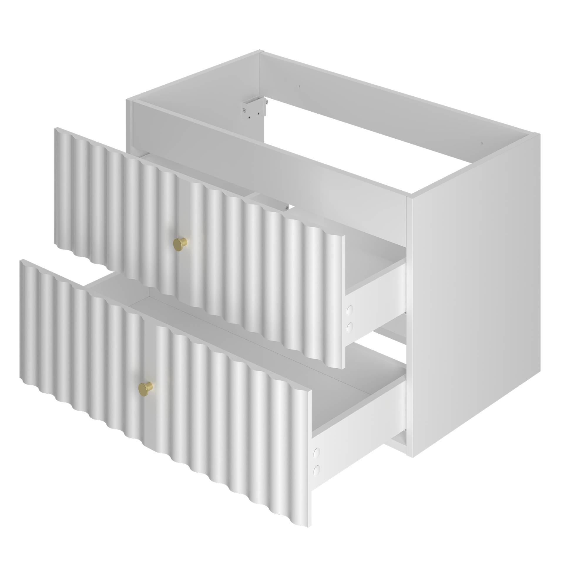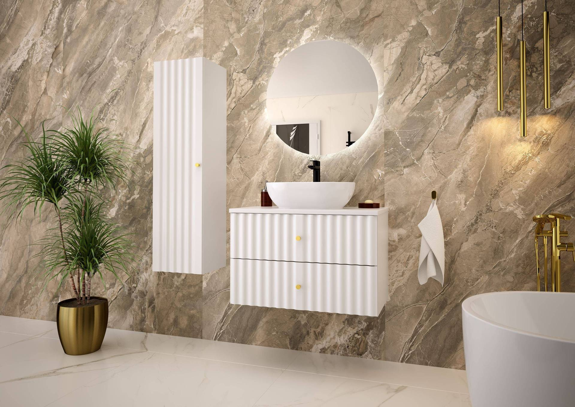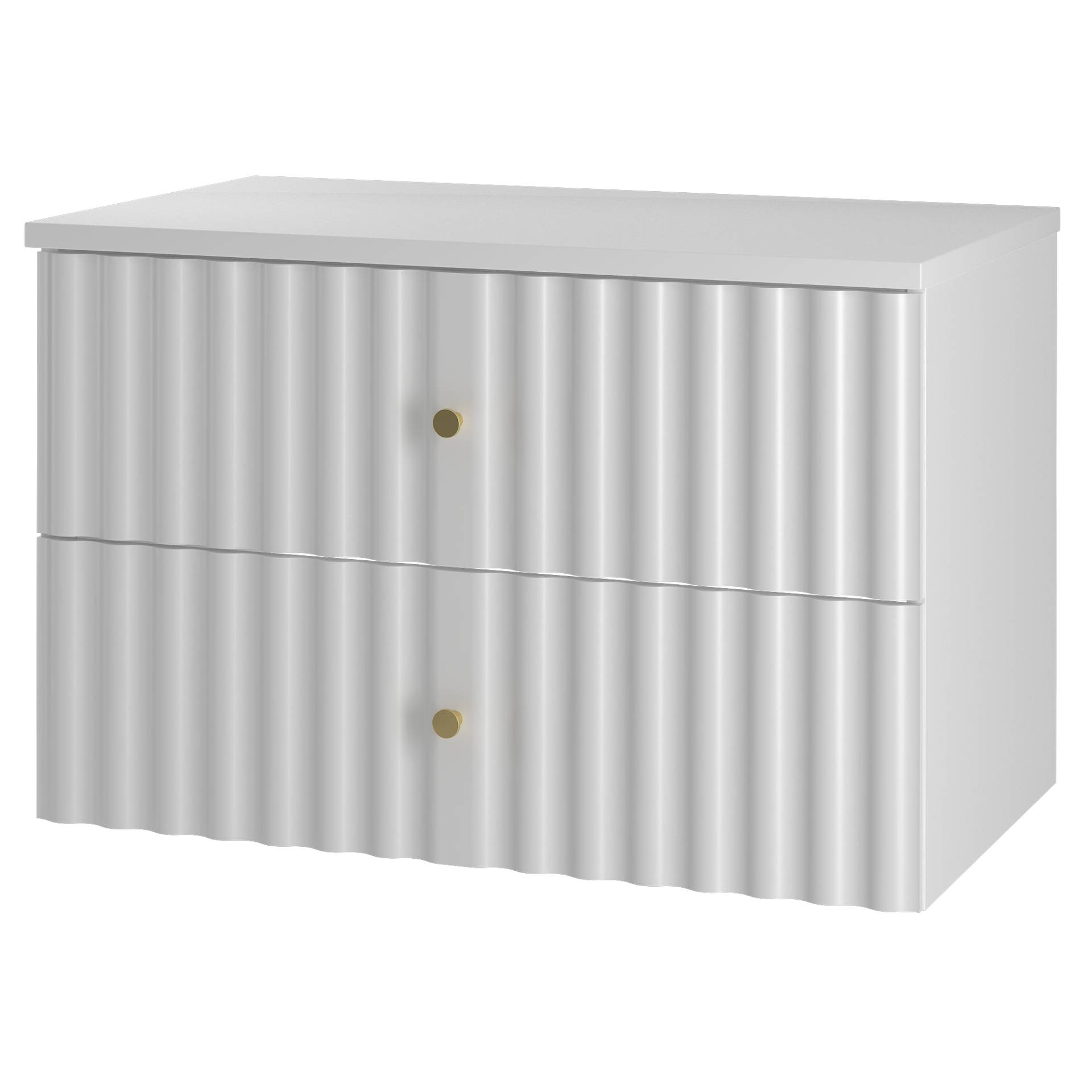 - Nowoczesna szafka pod umywalkę AQUA-01 w białym macie o szerokości 80 cm. Wykonana z płyty MDF, z blatem i cichymi prowadnicami. Eleganckie uchwyty w kolorze szczotkowanego złota dodają stylowego akcentu. Idealna do łazienki!
