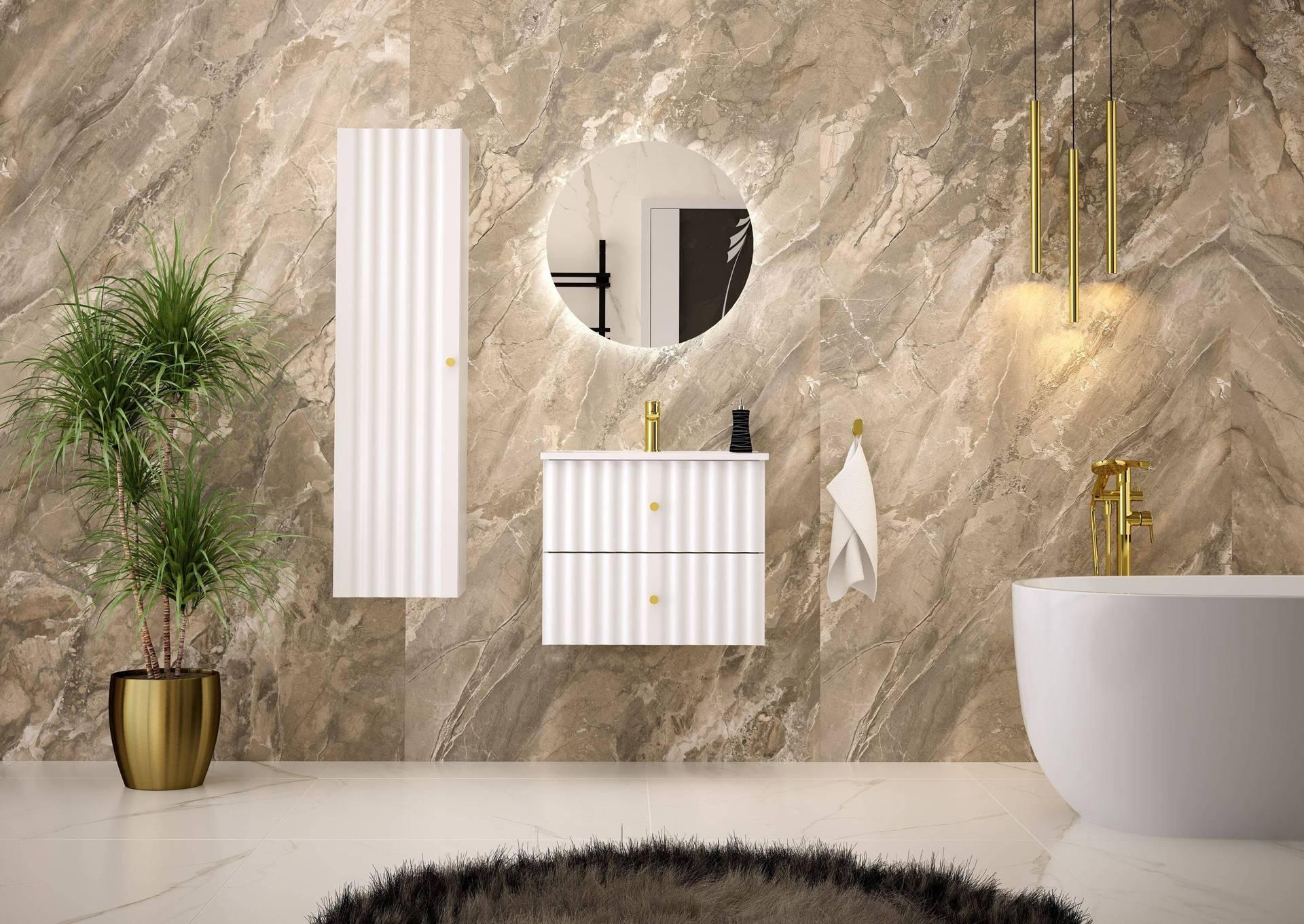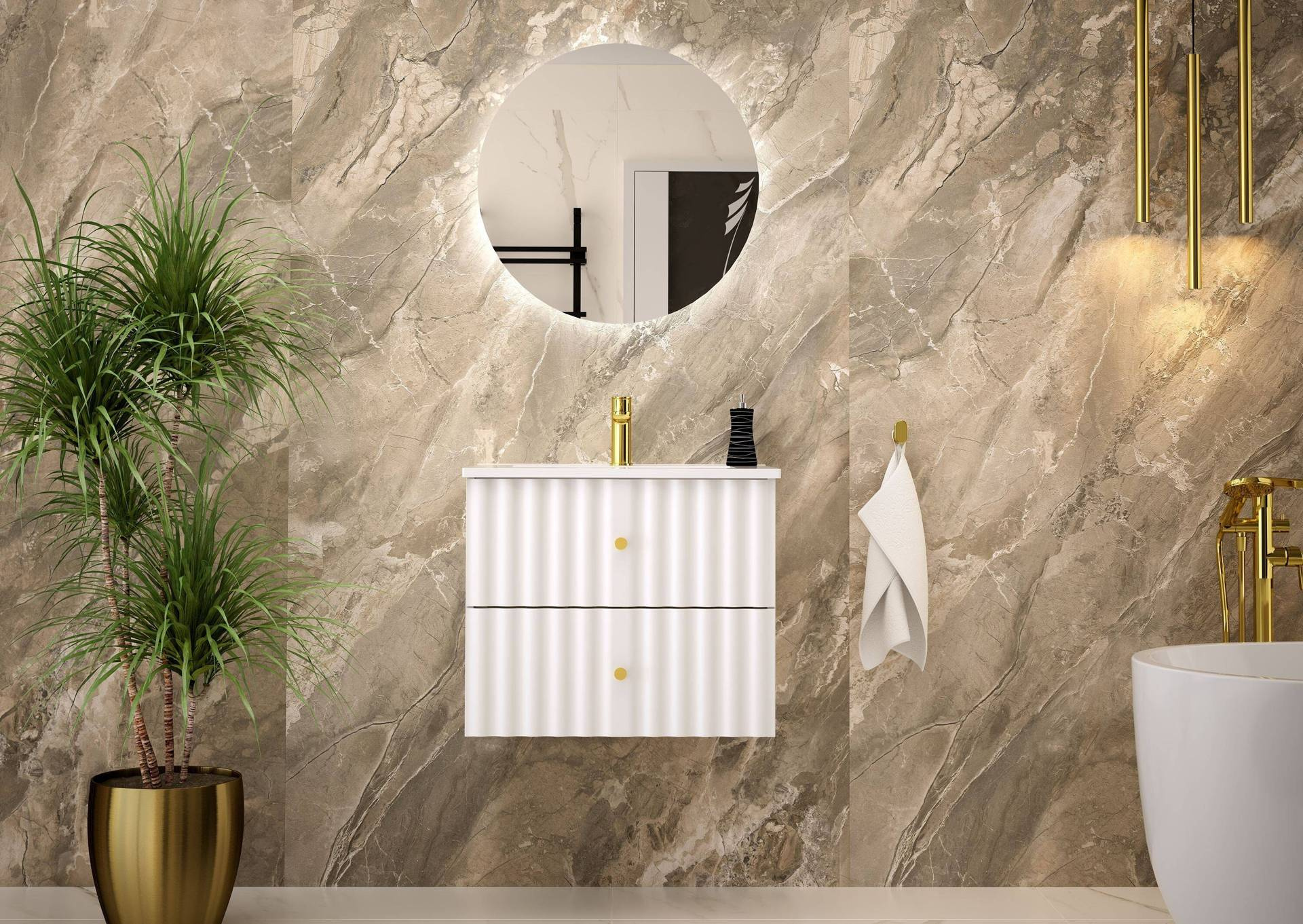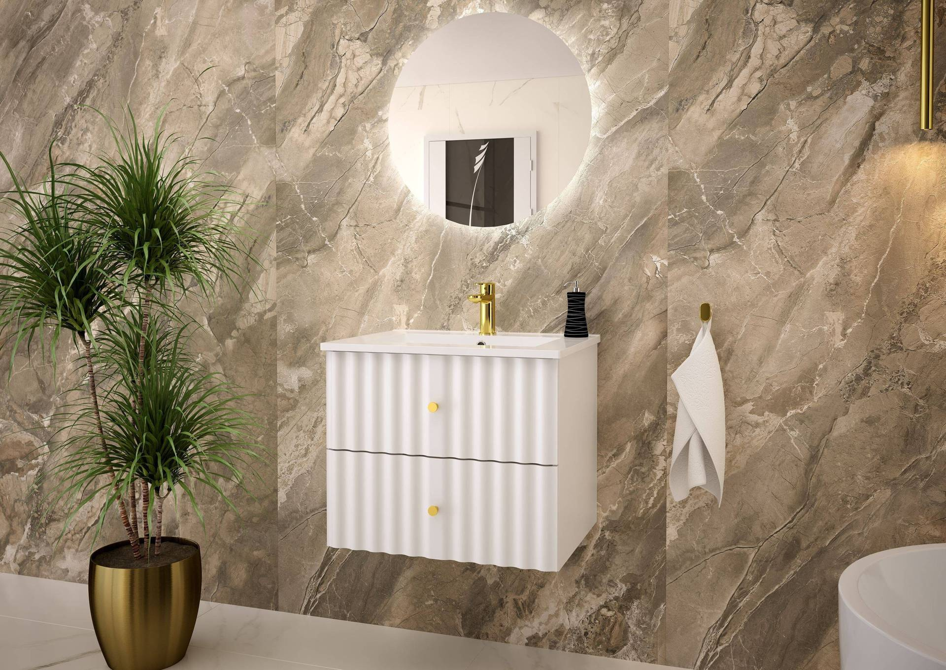 Stylowa szafka łazienkowa AQUA-02 z umywalką to doskonałe połączenie elegancji i funkcjonalności. Wykonana z płyty MDF i laminowanej, charakteryzuje się matowym białym wykończeniem i metalowymi uchwytami w kolorze złota. Ceramiczna umywalka.