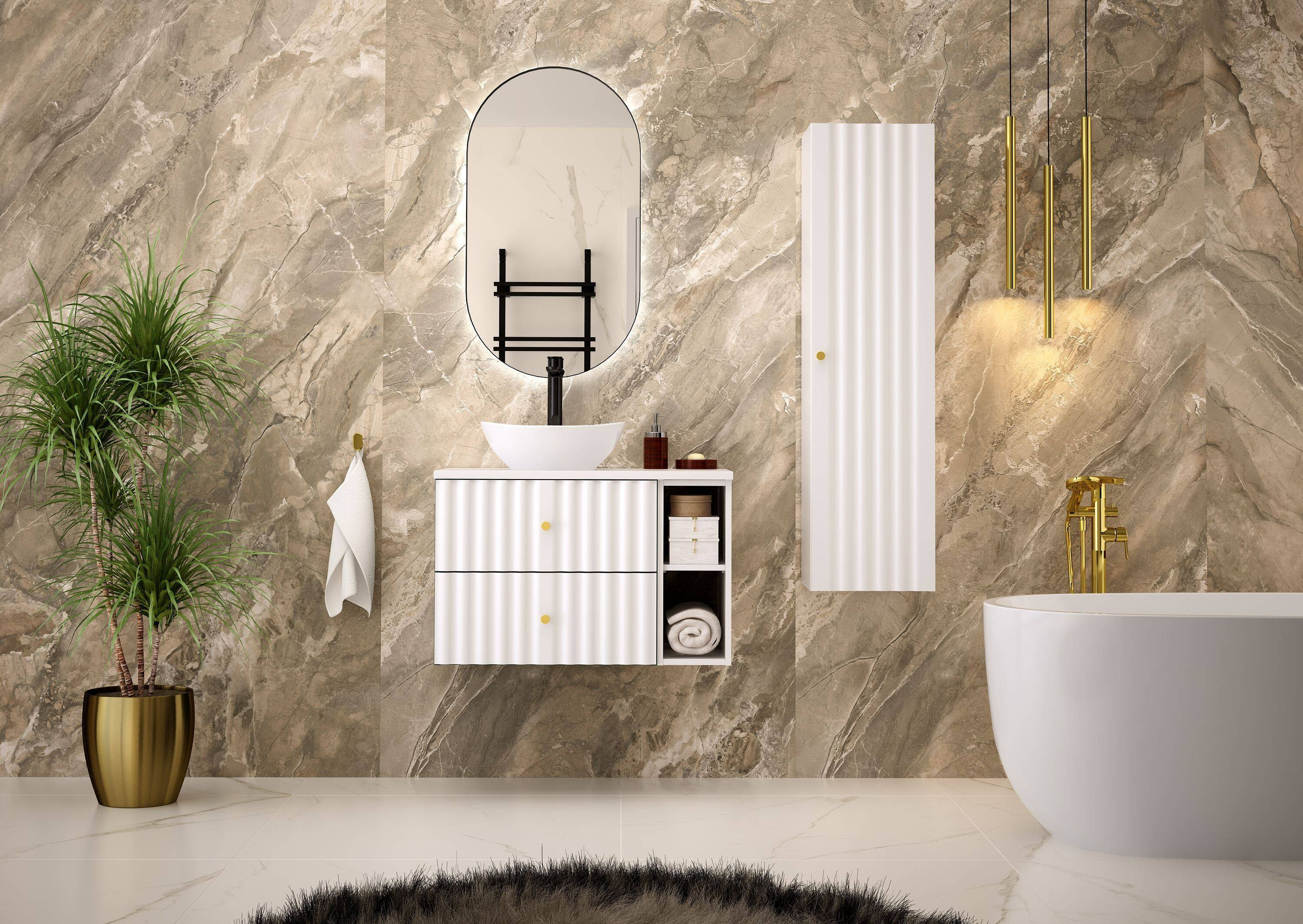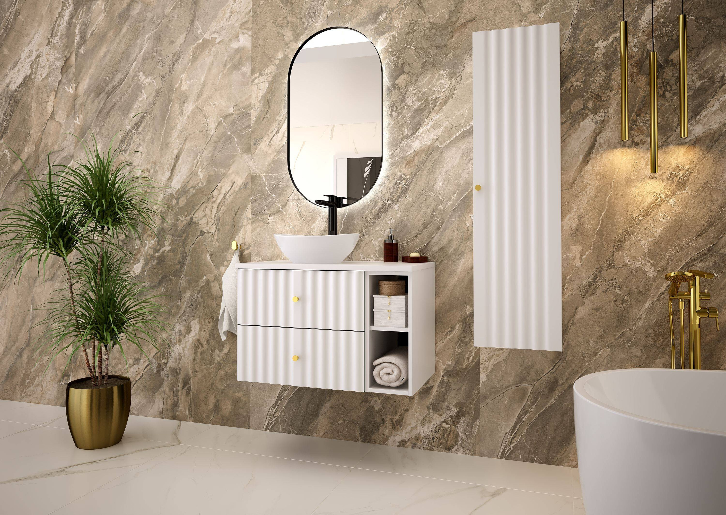 - Stylowa szafka pod umywalkę AQUA-02 marki Megstyl, o szerokości 80 cm, wykonana z wytrzymałej płyty MDF i laminowanej, w eleganckim białym macie. Wyposażona w cichy domyk i złote, szczotkowane uchwyty. Idealna do nowoczesnej łazienki.