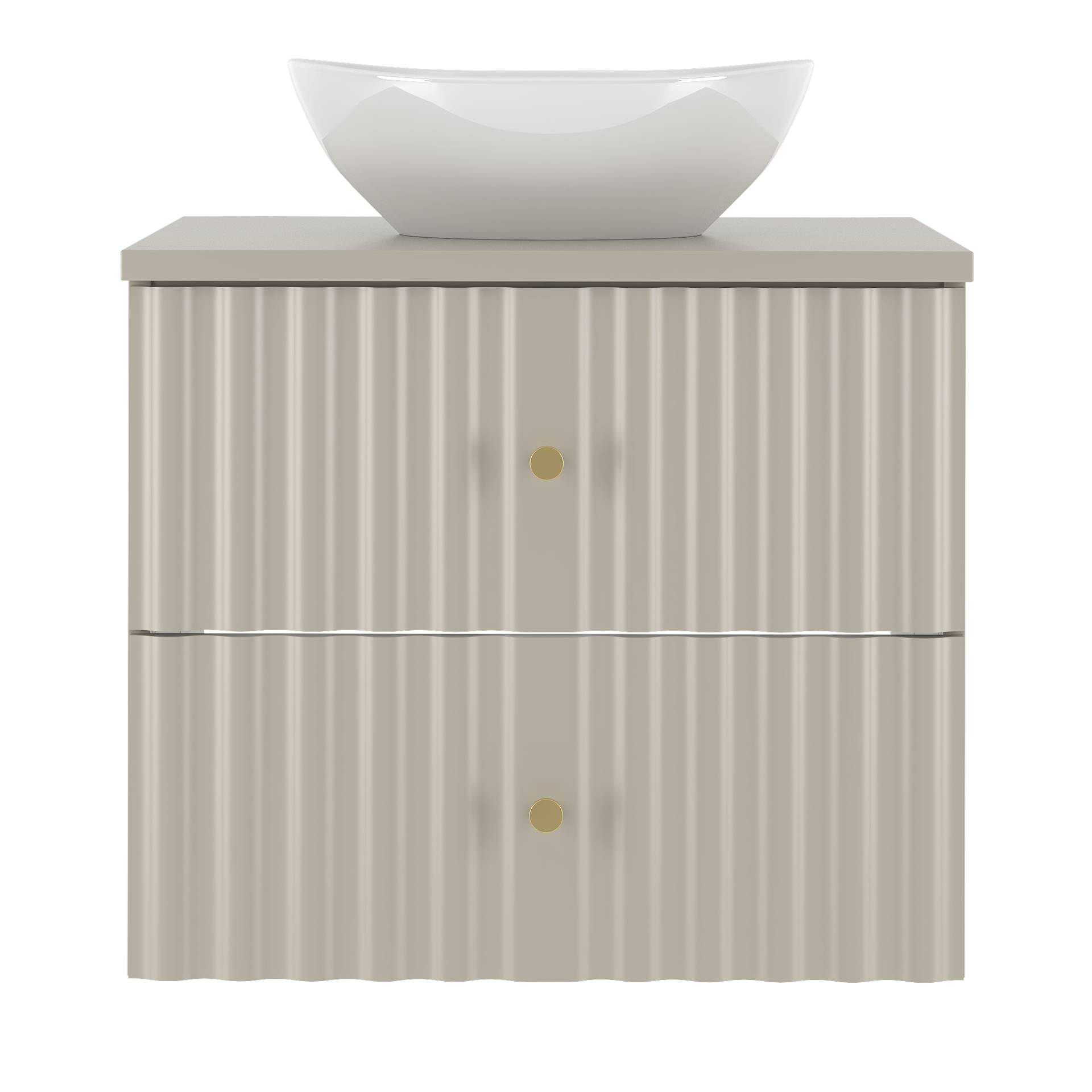 Blat i fronty szafki AQUA-02 wykonane są z wysokiej jakości płyty MDF, co zapewnia nie tylko trwałość, ale także nowoczesny wygląd. Wykończenie w kolorze kaszmiru współgra z lekkością białej, błyszczącej umywalki nablatowej z ceramiki sanitarnej. Ta harmonijna kombinacja materiałów i kolorów dodaje łazience subtelnej elegancji. Urokliwe uchwyty w szczotkowanym złocie stają się nie tylko funkcjonalnym, ale i dekoracyjnym elementem zestawu.