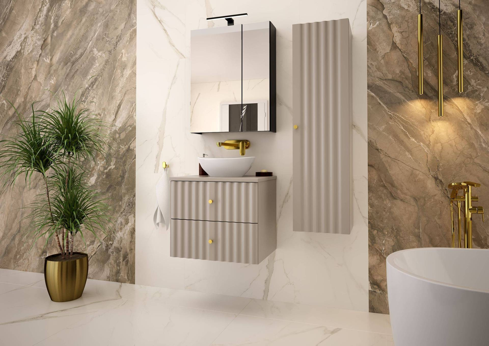 Elegancka szafka z umywalką od Megstyl, oferująca nowoczesny design w kolorze kaszmir. Wyposażona w metalowe uchwyty w kolorze szczotkowanego złota, cichy domyk oraz nablatową umywalkę z ceramiki sanitarnej. Idealna do stylowych łazienek.