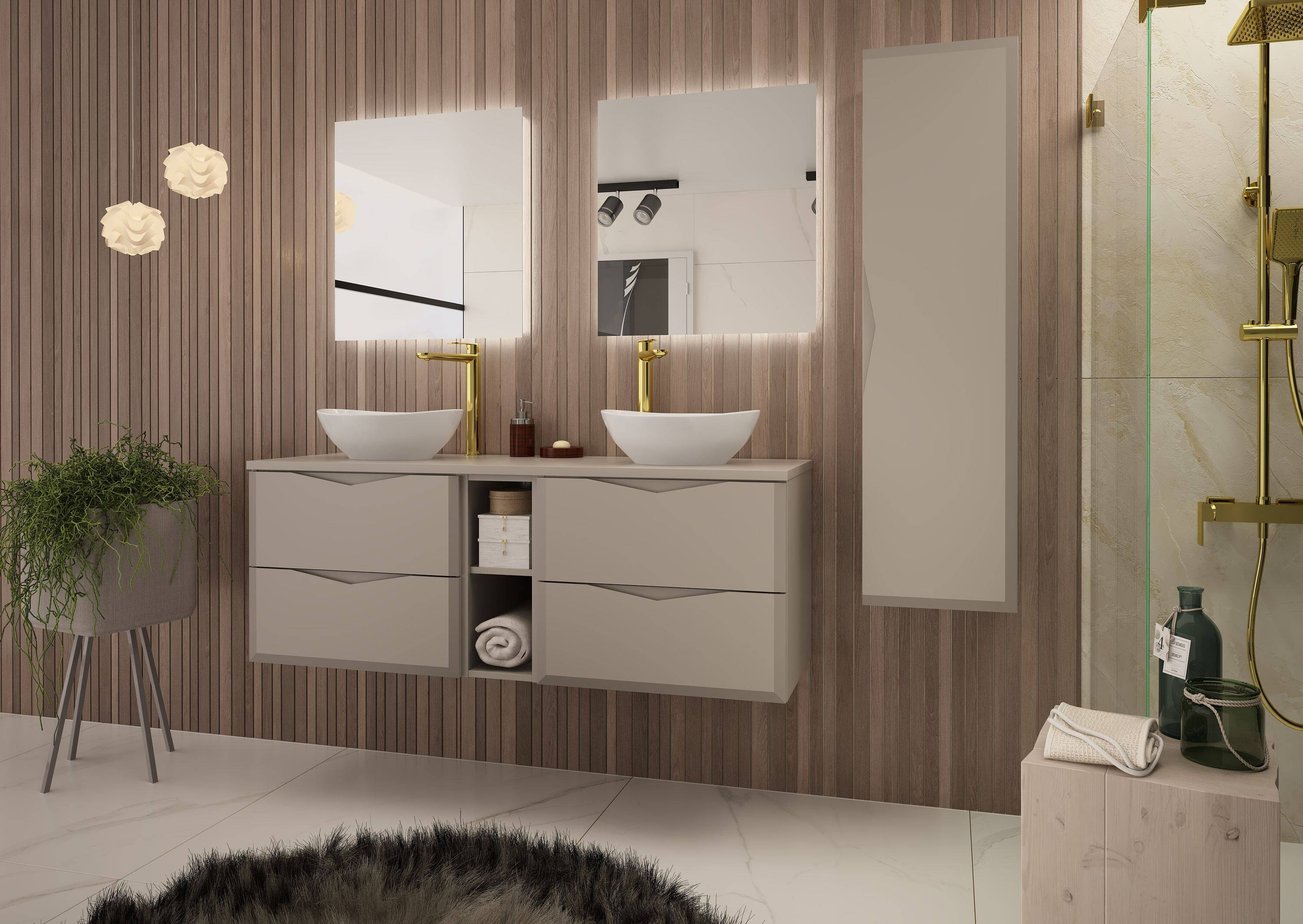 • Szafka DELICA-02 firmy Megstyl to eleganckie, kaszmirowe wykończenie i funkcjonalność. Wykonana z MDF i laminatu, posiada 4 szuflady z cichym domykiem. Idealna pod umywalkę, z pasującym blatem w zestawie. Estetyka i praktyczność w jednym.