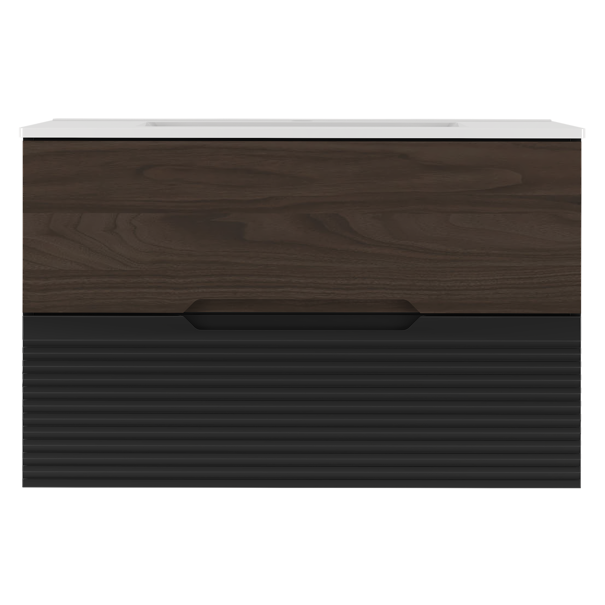 Szafka AVELLA-01 z umywalką łączy elegancję czarnego matu z orzechem. Fronty z MDF i korpus laminowany. Umywalka ceramiczna w połysku wpuszczana w blat. Funkcjonalność zapewnia system cichego domyku. Idealna do nowoczesnych łazienek. Samodzielny montaż.