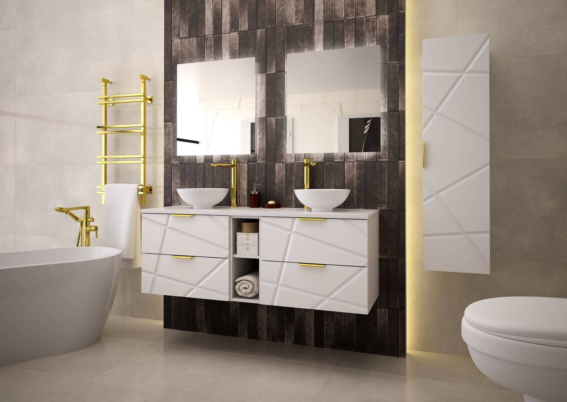 Szafka pod umywalkę Megstyl w białym macie to elegancja i funkcjonalność w jednym. Wykonana z MDF, z metalowymi uchwytami w złotym odcieniu. Ciche domykanie szuflad zwiększa komfort użytkowania. Idealna do nowoczesnych łazienek.