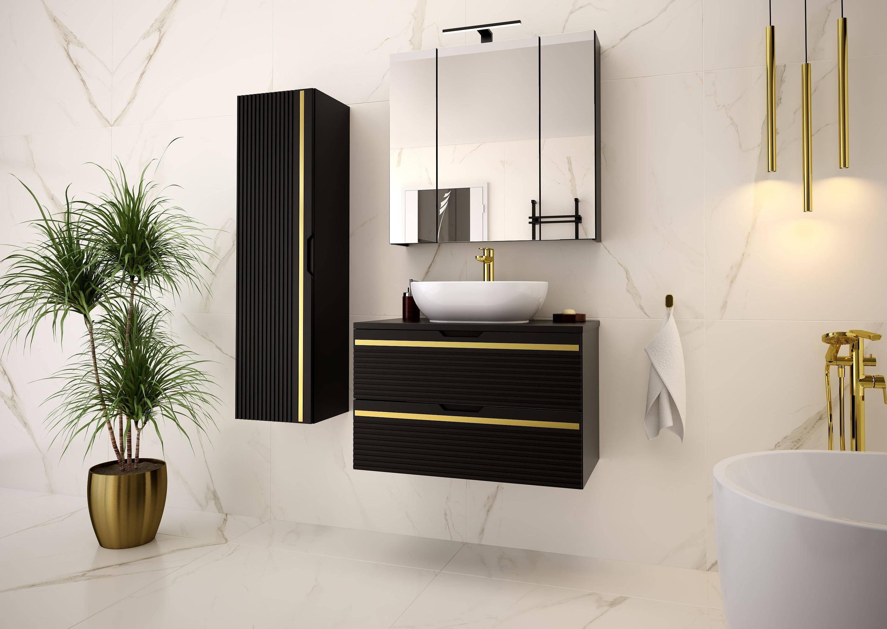 Blat wykonany z płyty MDF w kolorze czarnym matowym doskonale komponuje się z resztą konstrukcji, tworząc spójną i stylową całość. To rozwiązanie, które nie tylko zachwyca wyglądem, ale również gwarantuje trwałość i odporność na wilgoć, co jest kluczowe w łazienkowych warunkach. Montaż szafki jest prosty i przyjemny — można go wykonać samodzielnie w domu.