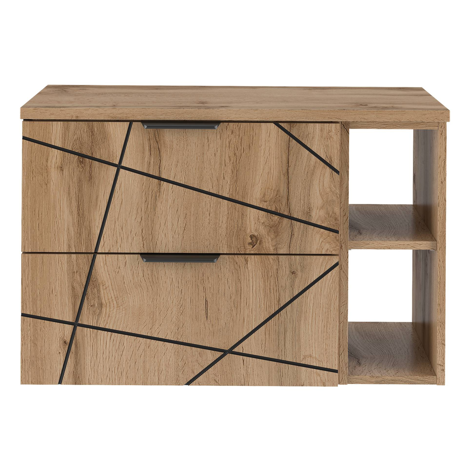 Szafka pod umywalkę WOOD-02 łączy nowoczesny styl z funkcjonalnością. Wykonana z płyt MDF i laminowanej w kolorze dąb Wotan, z cichymi prowadnicami i eleganckimi czarnymi matowymi uchwytami. Blat w zestawie. Idealna do samodzielnego montażu.