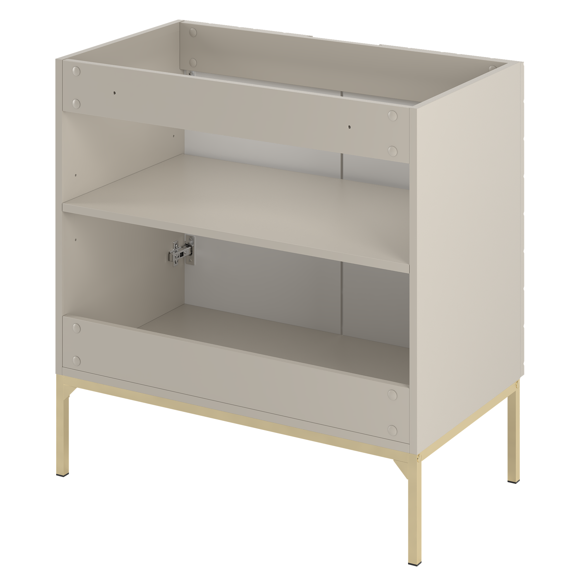 Elegancka szafka ASPEN-08 marki Megstyl pod umywalkę z blatem w kolorze kaszmir. Wykonana z płyty MDF i płyty laminowanej. Złoty metalowy stelaż dodaje luksusu. Funkcja cichego domyku. Blat w zestawie. Idealna do stylowej łazienki.