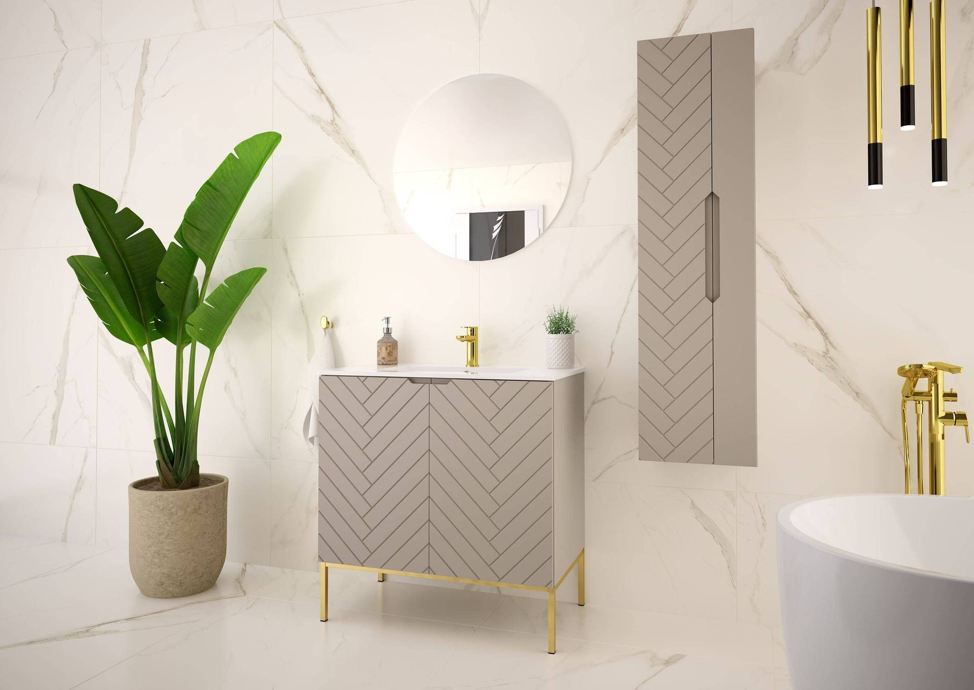 Odkryj elegancję i funkcjonalność dzięki szafce łazienkowej ASPEN-08 marki Megstyl. Ten wyjątkowy zestaw łączy nowoczesny styl z nutą luksusu, perfekcyjnie wpasowując się w każdą przestrzeń łazienkową. Kolor kaszmiru, dominujący zarówno na froncie, jak i korpusie, wprowadza harmonię, której potrzebujesz, by stworzyć łazienkę marzeń.