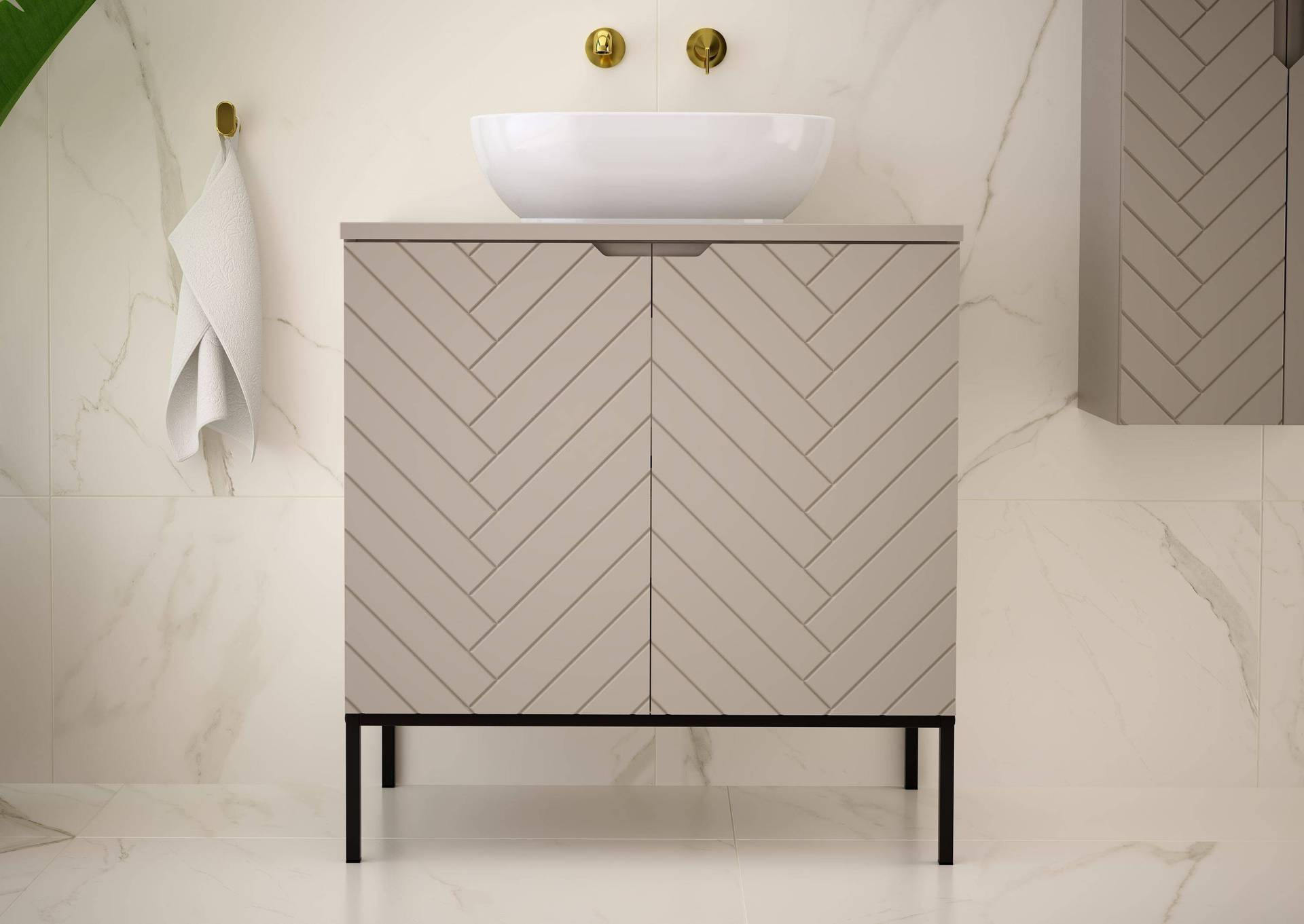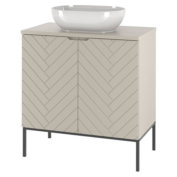 - Stylowa szafka ASPEN-08 o szerokości 80 cm z umywalką nablatową. Kaszmirowy front z MDF oraz laminowany korpus tworzą elegancką całość. Czarny metalowy stelaż dodaje nowoczesnego charakteru. Ceramika sanitarna w białym połysku zachwyca.