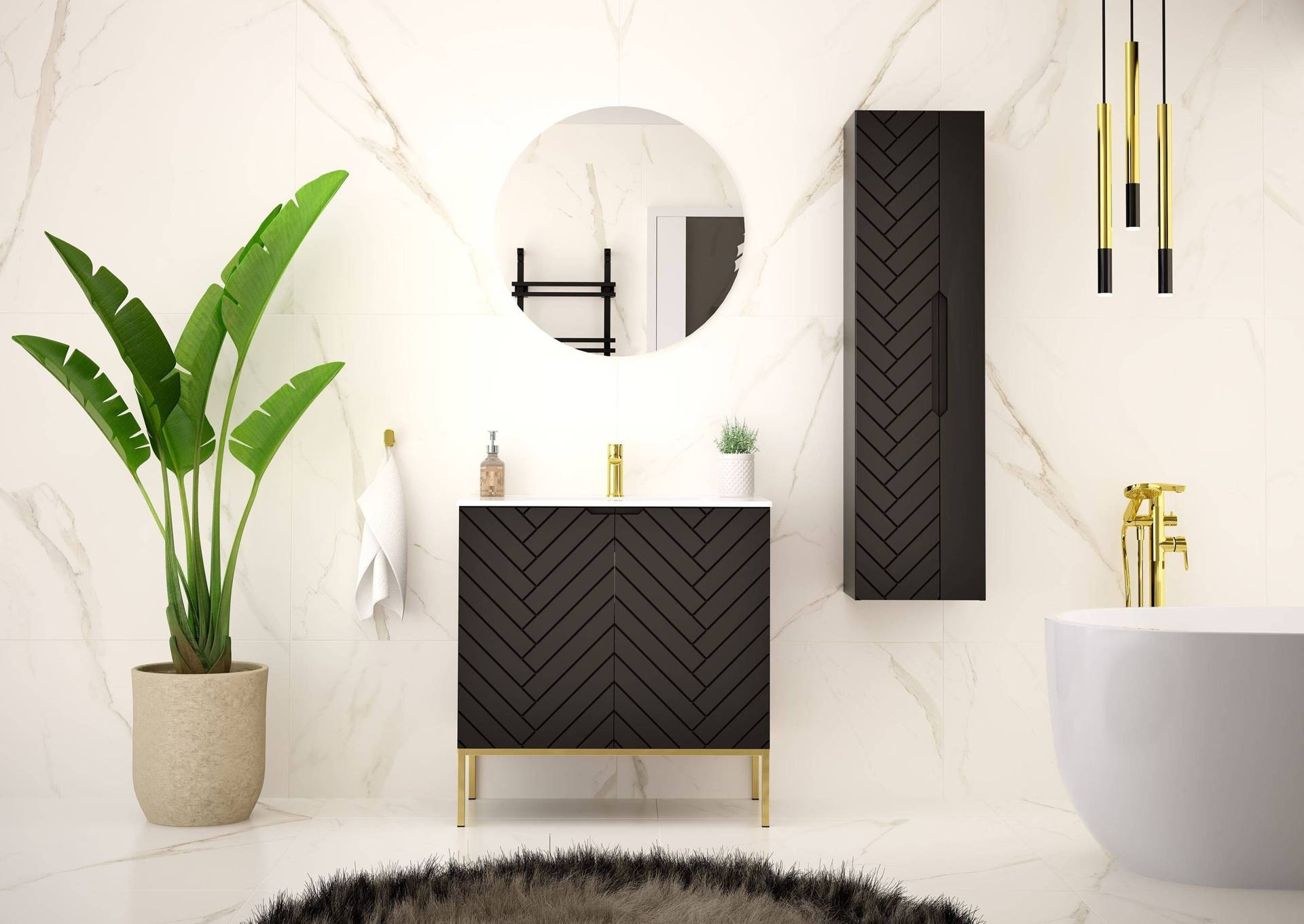 - Szafka z umywalką ASPEN-08 łączy nowoczesny design z funkcjonalnością. Kruczoczarne MDF i laminowany korpus w matowym wykończeniu nadają elegancji, podczas gdy złoty metalowy stelaż dodaje luksusowego akcentu. Cichy domyk zapewnia komfort użytkowania