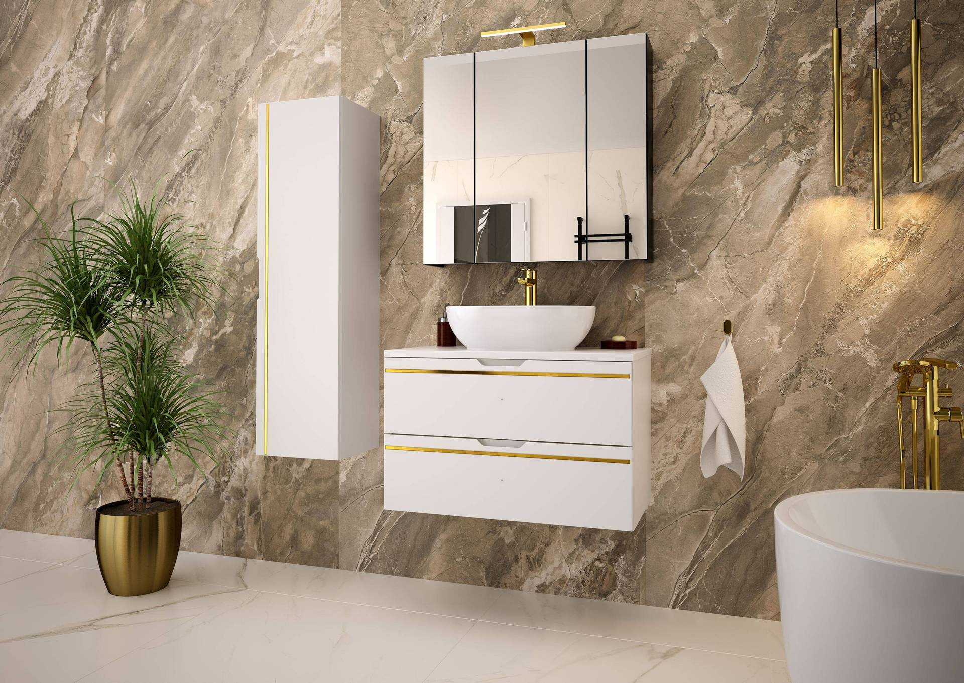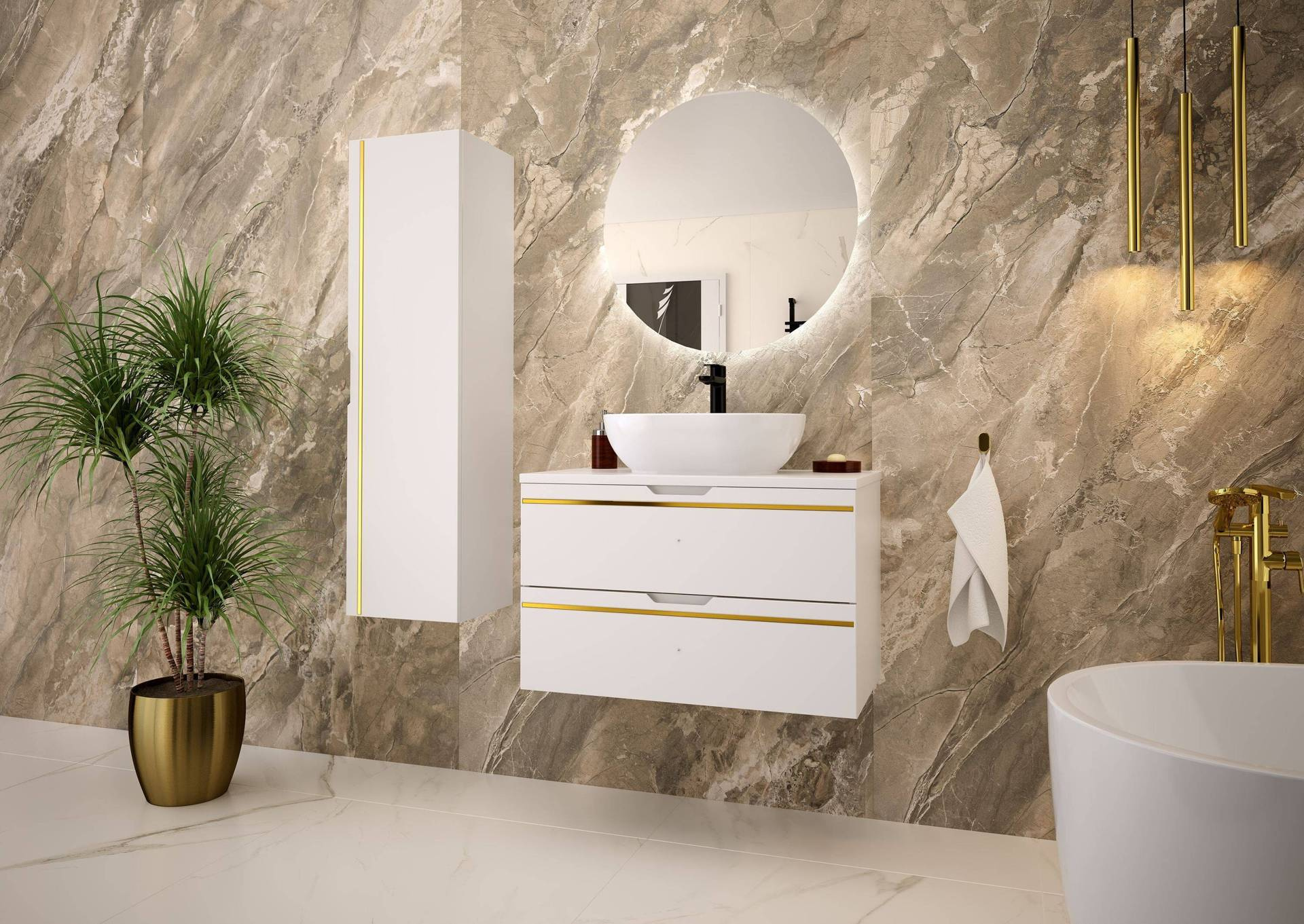Dzięki uniwersalnym wymiarom, wynoszącym 80 cm szerokości, 53 cm wysokości oraz 46 cm głębokości, szafka doskonale wpisuje się w różnorodne przestrzenie łazienkowe, oferując jednocześnie wystarczająco dużo miejsca do przechowywania. Pozwól, aby ESPERO-01 stała się częścią Twojej łazienki i wprowadziła do niej powiew świeżości oraz niebanalny design.