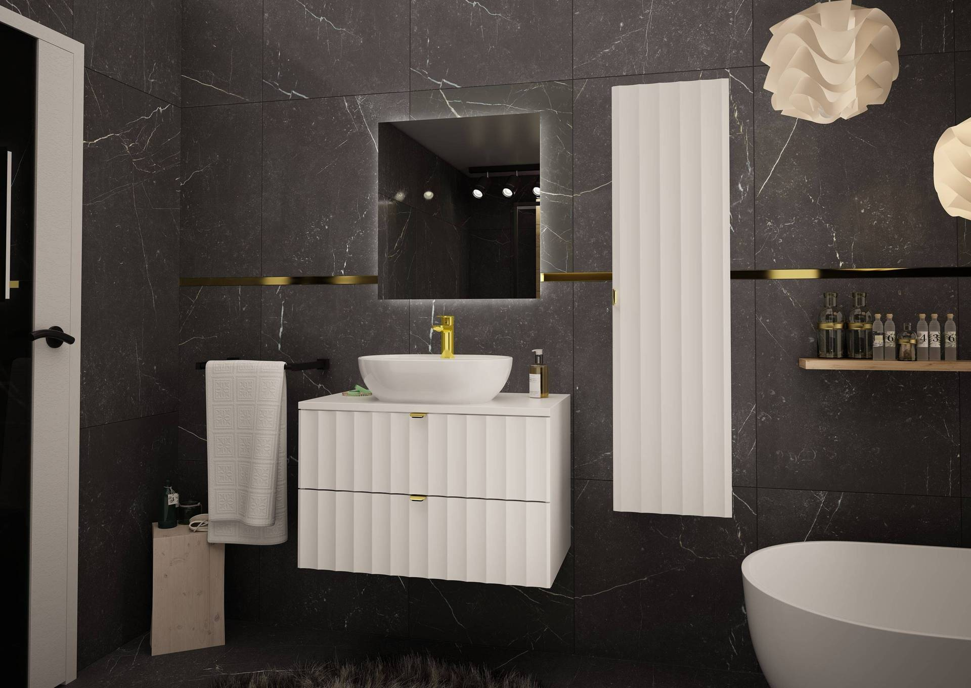 Zestaw ARCOS-07 to nie tylko estetyka, ale także funkcjonalność na najwyższym poziomie. Cichy domyk zapewnia bezszelestne zamykanie szuflad, a metalowe uchwyty w kolorze szczotkowanego złota dodają całemu projektowi luksusowego charakteru. Taki detal sprawi, że mebel zyska wyjątkowy akcent, który z pewnością przyciągnie uwagę gości i stanie się ozdobą każdej łazienki.