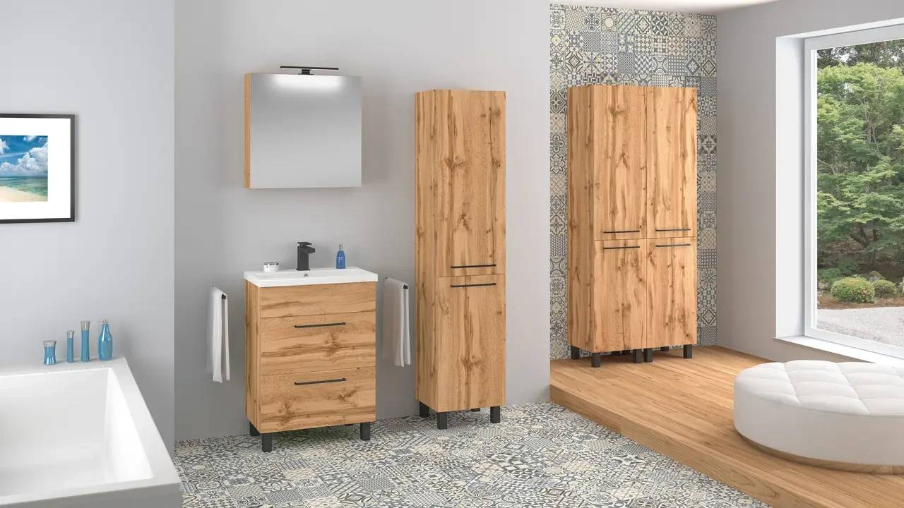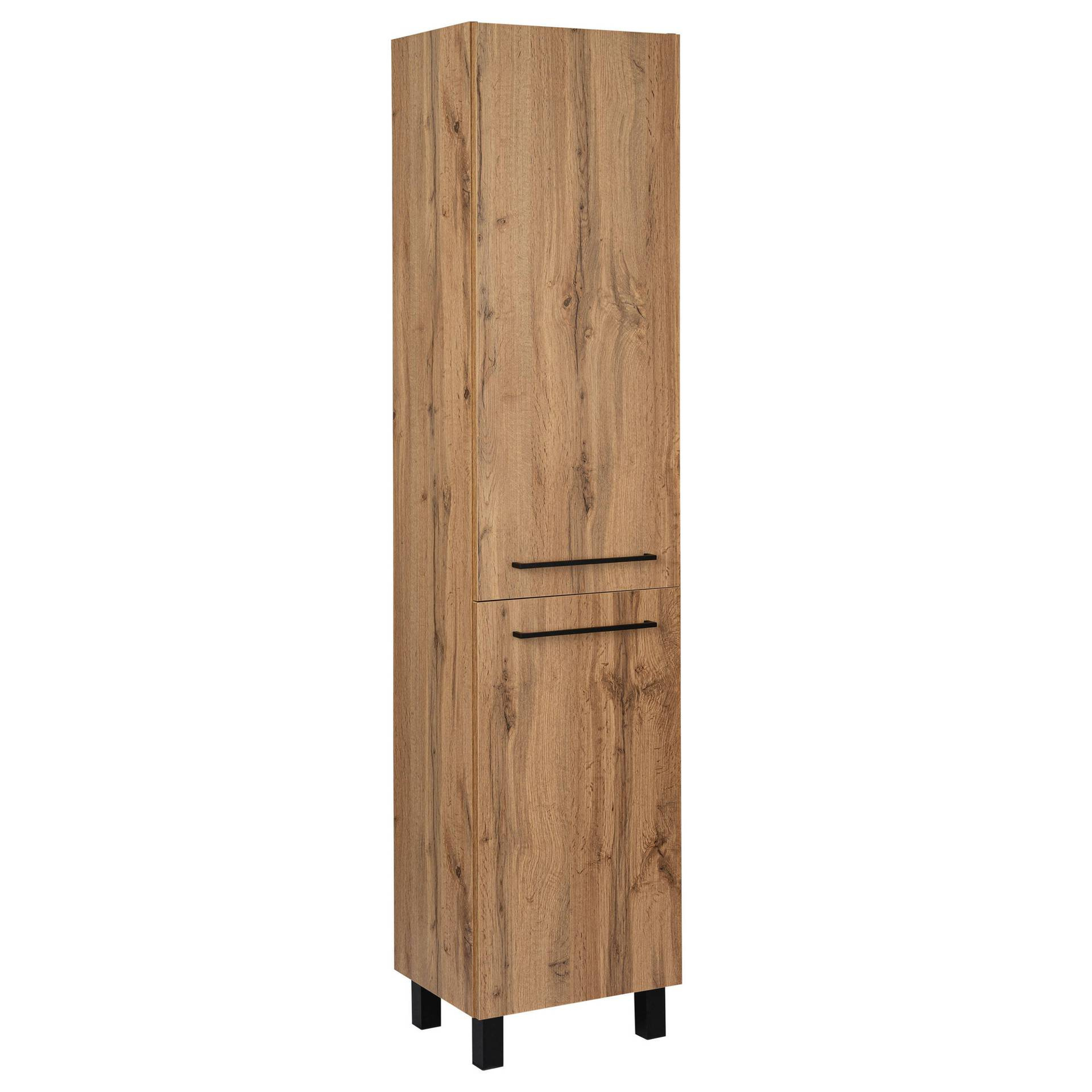 Wysoki słupek Astor w kolorze Dąb Wotan to elegancki dodatek do każdego wnętrza. Wykonany z płyty laminowanej, posiada ciche domykanie drzwi i stylowe czarne metalowe uchwyty oraz nogi. Idealny do samodzielnego montażu.