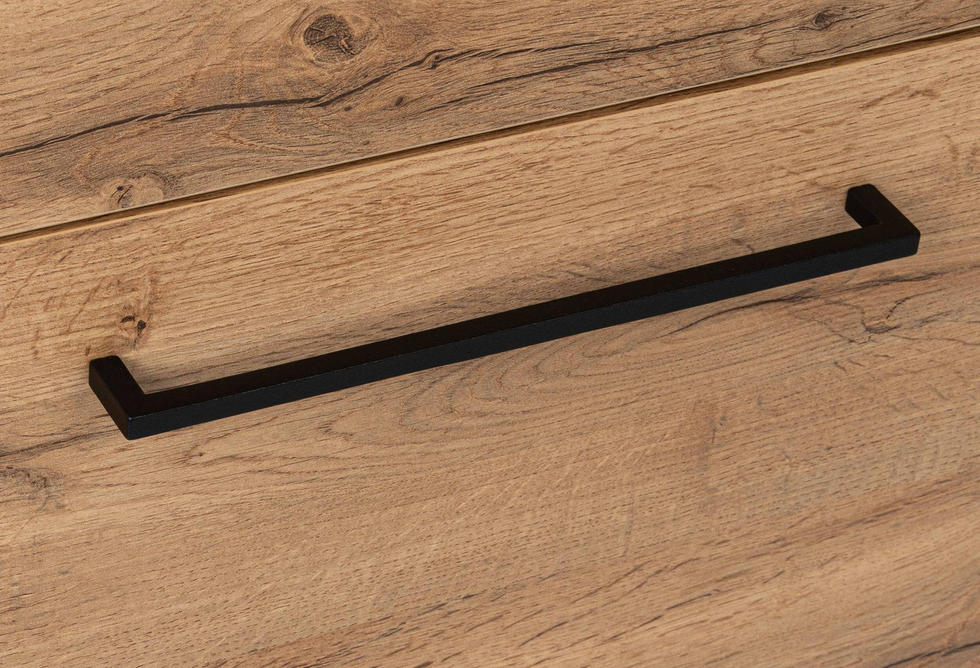 Konstrukcja mebla opiera się na stabilnych, czarnych metalowych nogach, które dodają mu wyrafinowanego stylu, a jednocześnie zapewniają solidne podparcie. Praktyczność tego mebla idzie w parze z elegancją, czyniąc go idealnym wyborem dla osób, które pragną harmonijnie połączyć użytkowość z walorami estetycznymi. Dąb Wotan to kolor, który dodaje ciepła i przytulności, tworząc przyjemne, naturalne wrażenie w każdym pomieszczeniu.