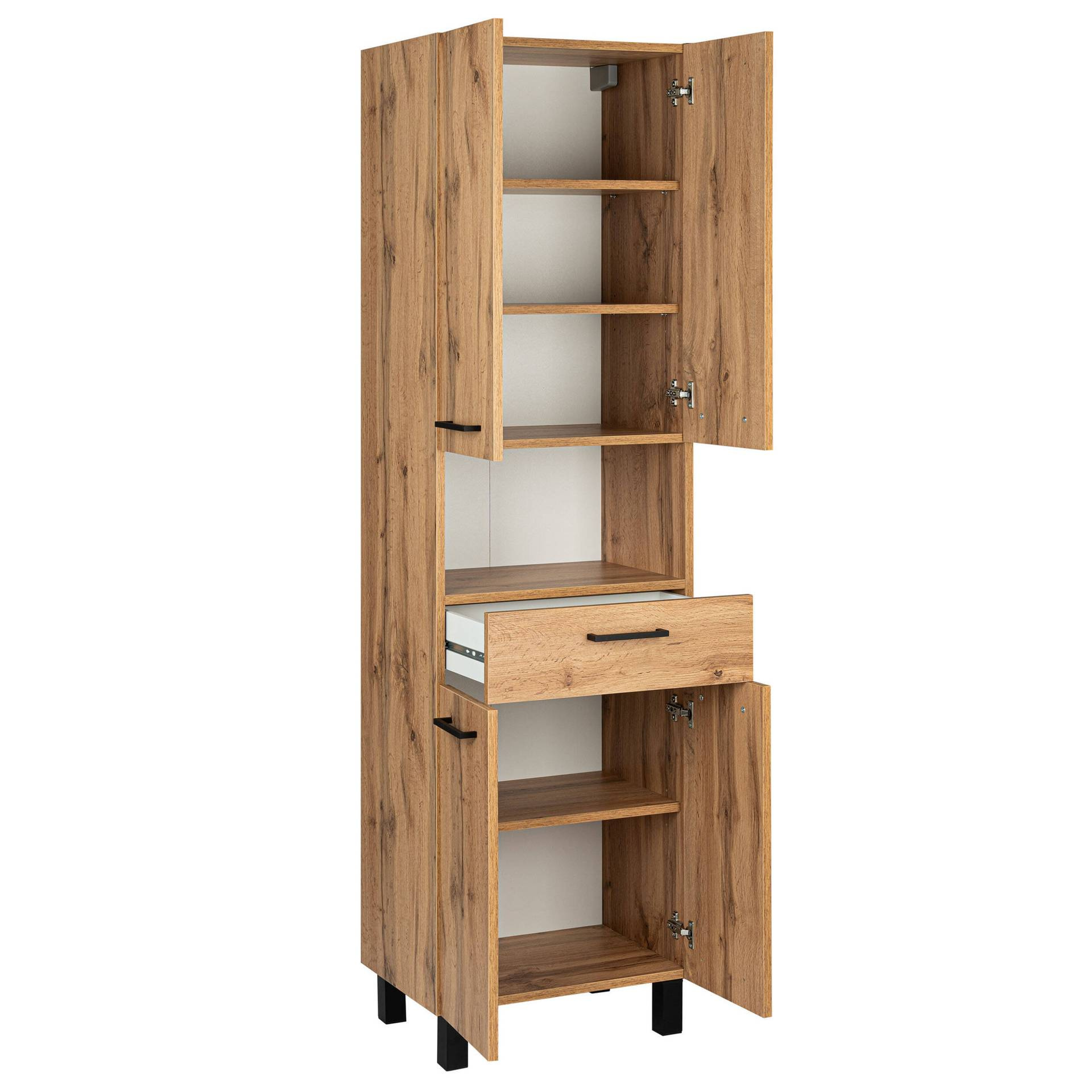 Słupek wysoki Astor Lupo w eleganckim kolorze dębu Wotan. Wykonany z laminowanej płyty, posiada czarne metalowe uchwyty i nogi, co nadaje nowoczesnego charakteru. Doskonały do samodzielnego montażu. Idealny na przechowywanie, łączy styl z funkcjonalnością