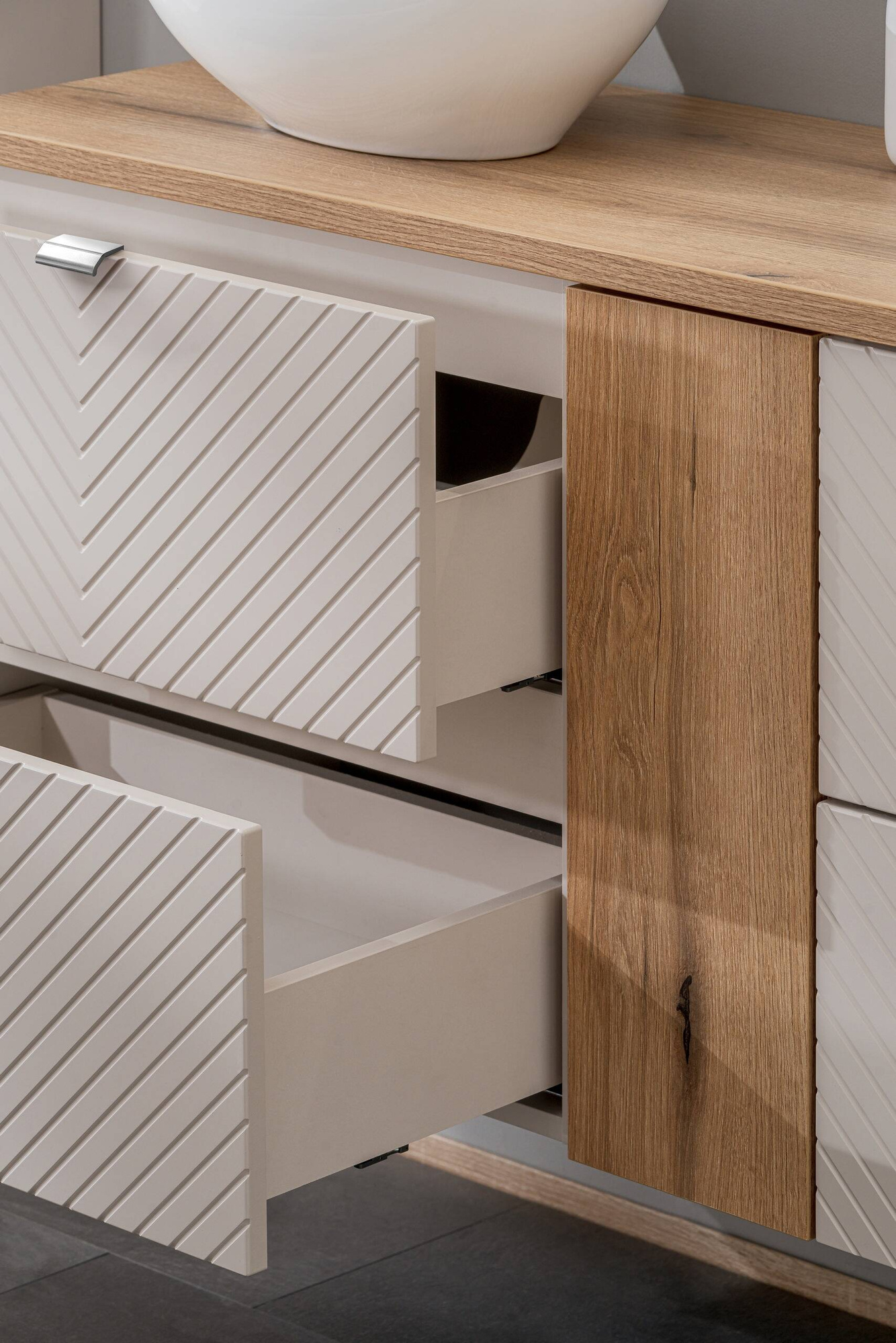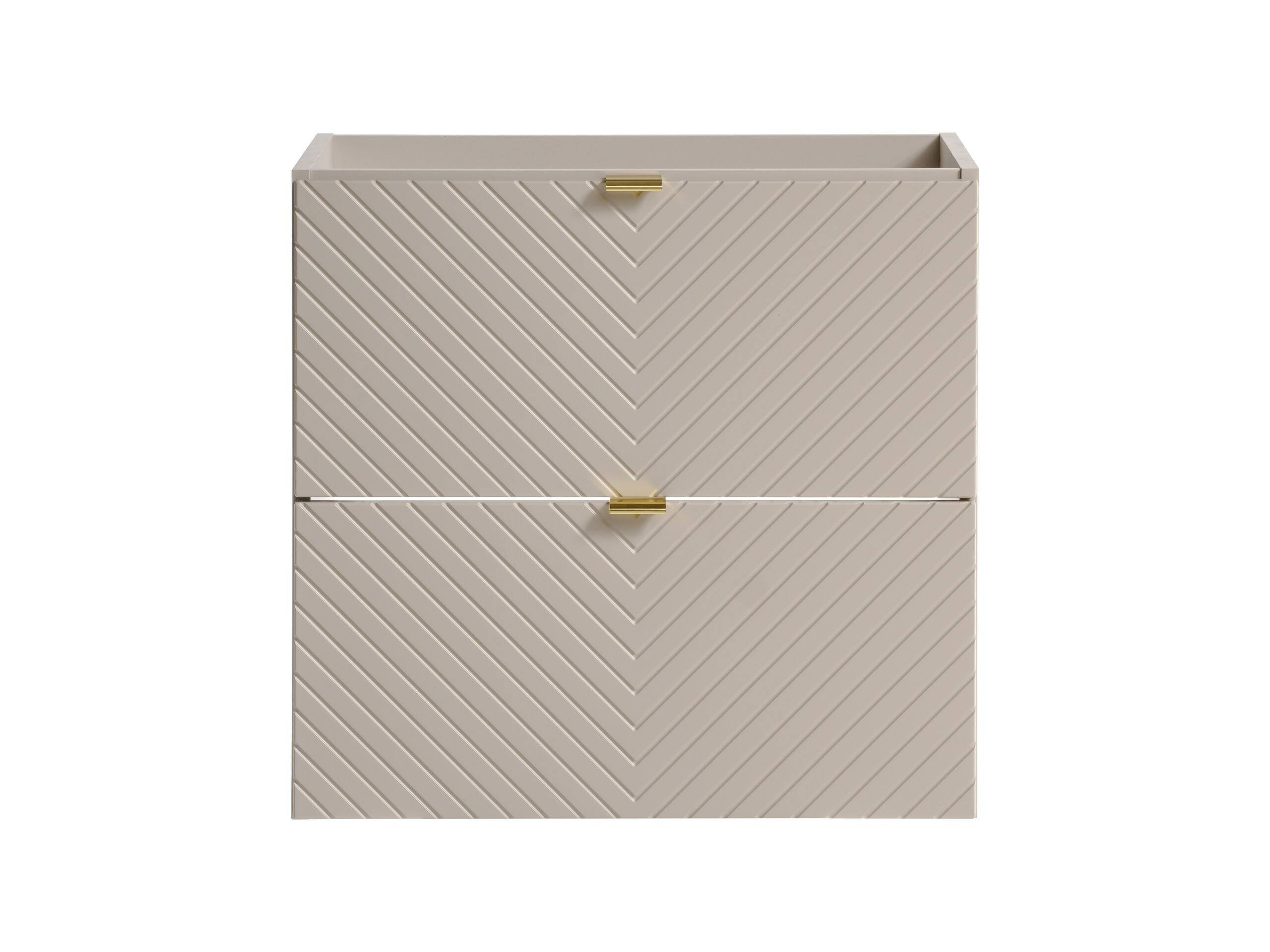 - Szafka pod umywalkę Viva Cashmere 60 cm to elegancki mebel z dwiema pojemnymi szufladami, wykonany z trwałych materiałów. Subtelne frezowane fronty w kształcie jodełki w odcieniu kaszmiru oraz różne uchwyty pozwalają na personalizację. Ciche domykanie.