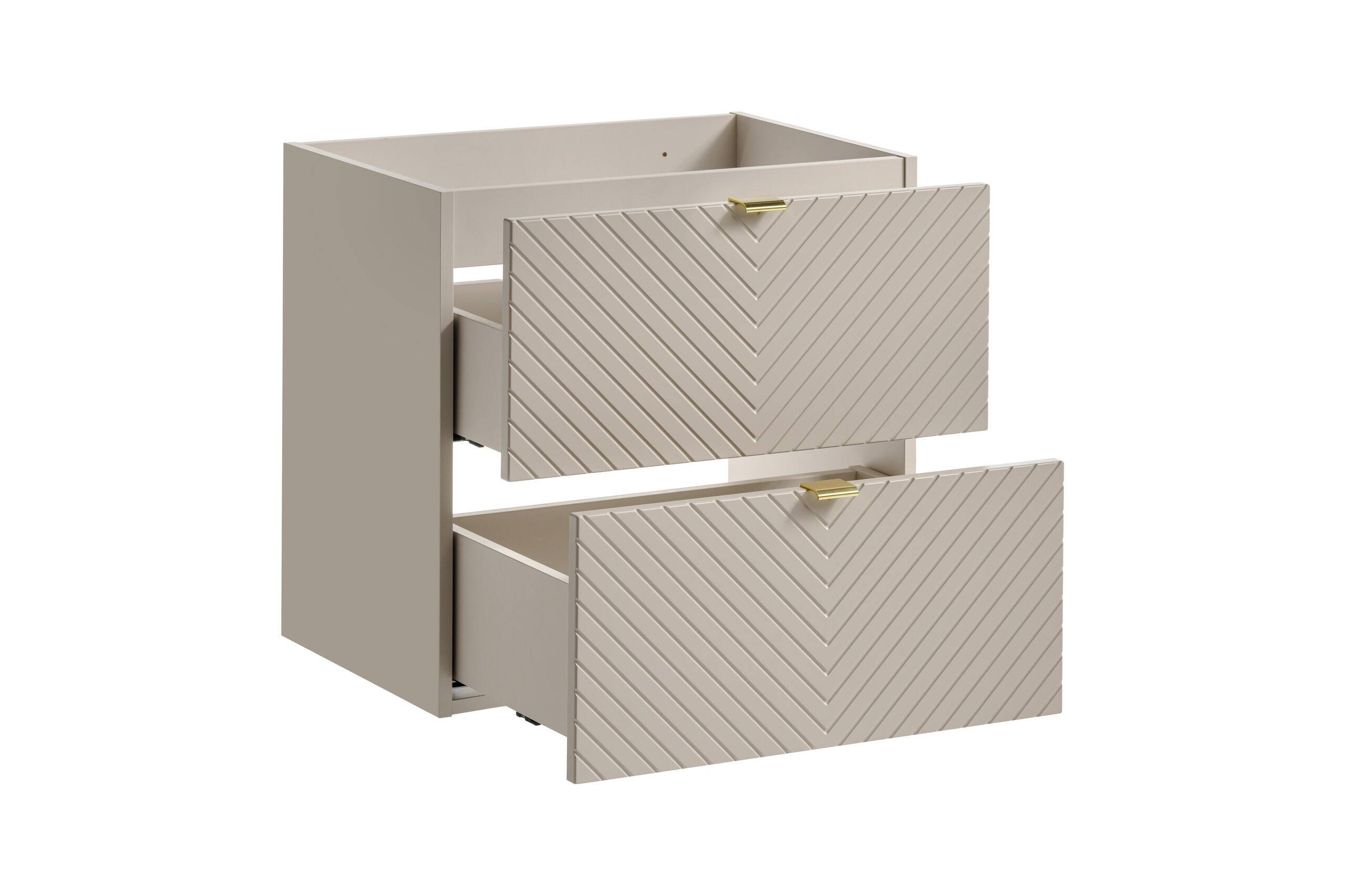 Szafka pod umywalkę Viva Cashmere 60 cm to elegancki mebel z dwiema pojemnymi szufladami, wykonany z trwałych materiałów. Subtelne frezowane fronty w kształcie jodełki w odcieniu kaszmiru oraz różne uchwyty pozwalają na personalizację. Ciche domykanie.