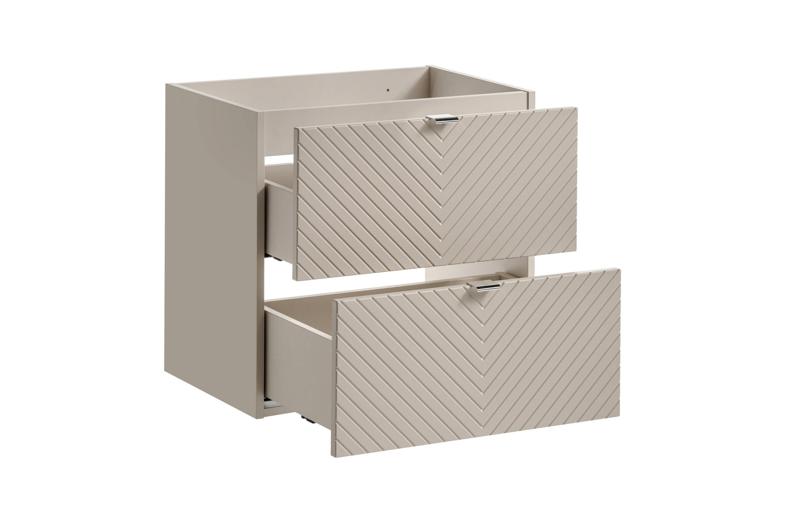 Zestaw szafka pod umywalkę z kolekcji Viva Cashmere to połączenie elegancji i funkcjonalności. Dwie sztormowe szuflady z cichym domykaniem, trójwymiarowe fronty w jodełkę oraz szeroka gama kolorów uchwytów pozwalają na indywidualną aranżację wnętrza.