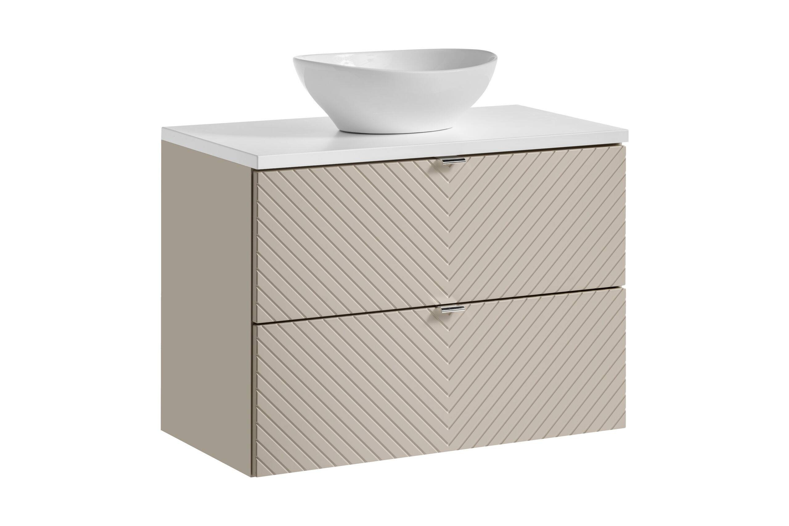 Zestaw Szafka z Umywalką i Blatem 2 Szuflady 80 cm Viva Cashmere to prawdziwa perełka dla każdego, kto pragnie wprowadzić odrobinę elegancji do swojej łazienki. Jego subtelna estetyka łączy w sobie nowoczesny design oraz komfort użytkowania, dzięki czemu staje się idealnym rozwiązaniem zarówno dla małych, jak i większych wnętrz. Stylowy kolor kaszmirowy mat w połączeniu z frezowanymi frontami w kształcie jodełki tworzy wyjątkowy efekt, który przyciąga wzrok i nadaje charakteru każdemu pomieszczeniu.