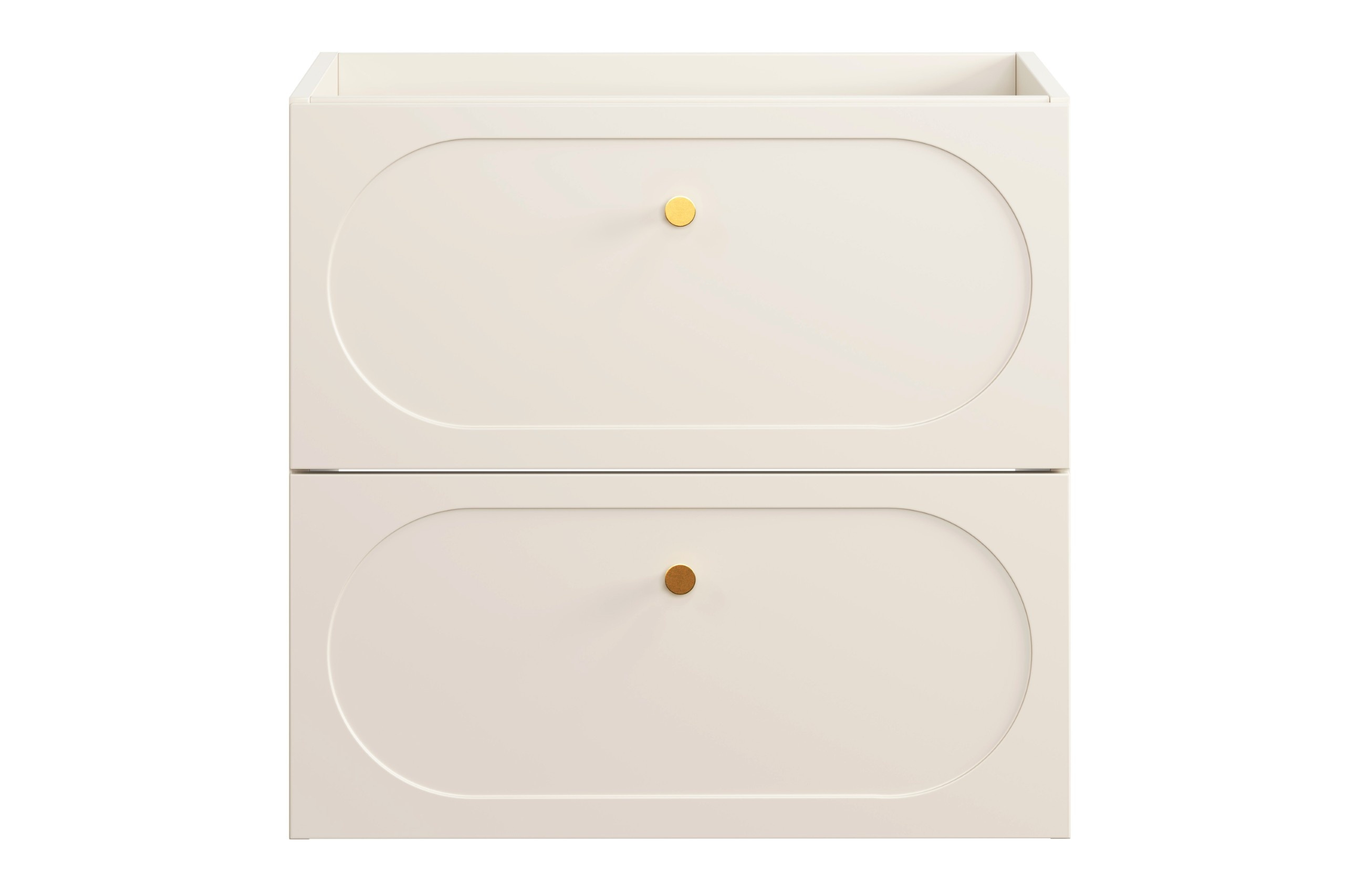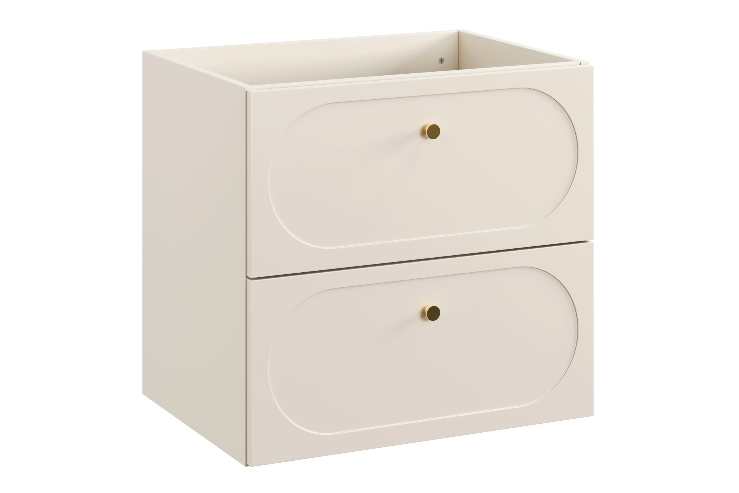 - Elegancka szafka pod umywalkę Donna Sand o szerokości 60 cm to połączenie nowoczesności i klasyki. Beżowe fronty z frezowaniem oraz złote metalowe uchwyty tworzą harmonijną całość. Dwie pojemne szuflady z systemem cichego domykania zapewniają komfort.