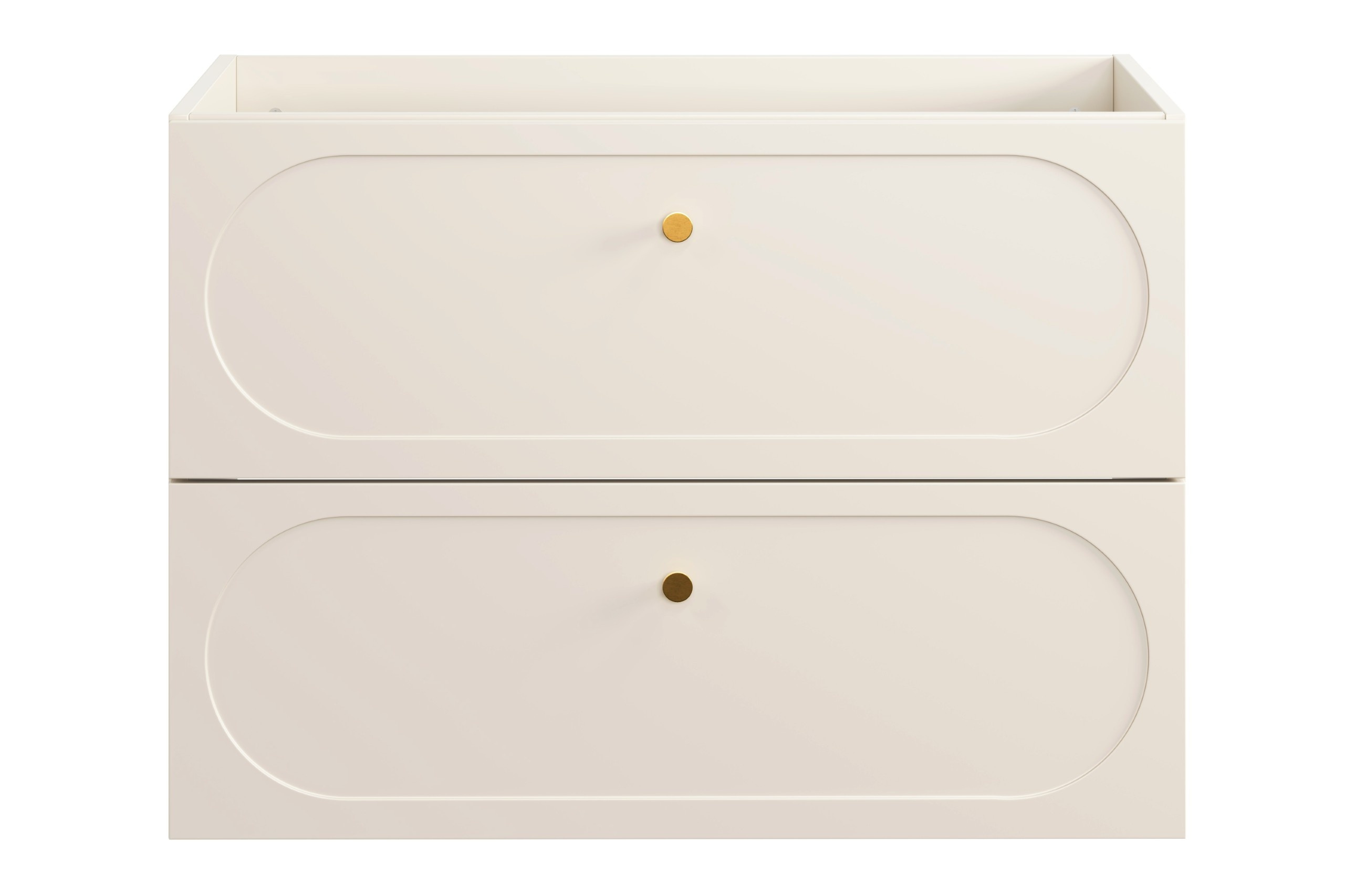 Szafka pod umywalkę Donna Sand 80 cm to połączenie nowoczesności i klasyki. Delikatne fronty w kolorze Beż Piaskowy oraz złote metalowe gałki dodają elegancji. Dwie szuflady z cichym domykaniem zapewniają wygodne przechowywanie akcesoriów.