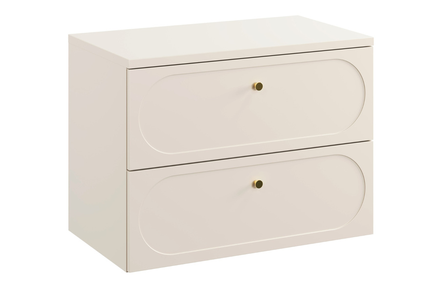 Zestaw Szafka Pod Umywalkę z Blatem 80 cm 2 Szuflady Donna Sand to perfekcyjne rozwiązanie dla wszystkich, którzy pragną połączyć praktyczność z elegancją w swojej łazience. Wykonany w delikatnym kolorze Beż Piaskowy, ten zestaw nie tylko wprowadza cieplejszą aurę do wnętrza, ale także wspaniale komponuje się z różnorodnymi stylami aranżacyjnymi. Ozdobiony złotymi, metalowymi gałkami, z lekko zaokrąglonymi frontami, oferuje wyjątkowy charakter, a zarazem nadaje lekkości oraz subtelności każdemu pomieszczeniu.